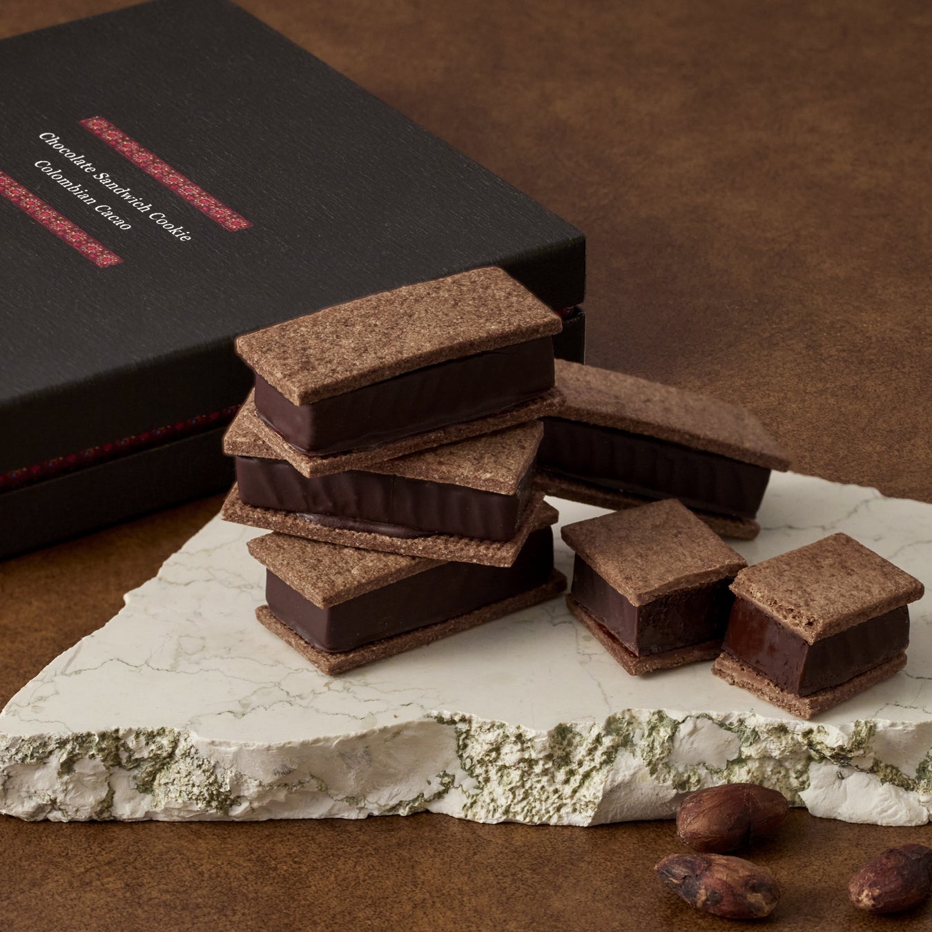 フルーティーで華やかな香りを持つコロンビア産カカオのチョコレートを使用した、大人のためのショコラサンドクッキー。パリッとした薄いチョコレートの中から感じる、ガナッシュの滑らかなくちどけ。サクッとした薄焼きクッキーから漂う香ばしいカカオの香り。コロンビアンカカオの濃厚でほろ苦いおいしさが、口の中でゆっくりととろけていきます。コク深い味わいと豊かな余韻をぞんぶんにご堪能ください。
