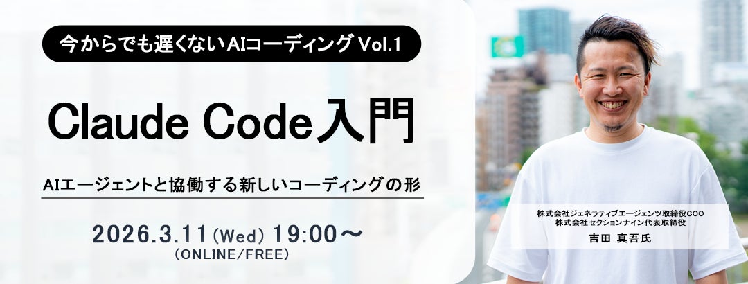 株式会社MCEAホールディングス(東京都港区/代表取締役社長 齋藤 武育)のグループ会社で、 ITエンジニアの新しい働き方を提案する株式会社PE-BANK(東京都港区/代表取締役社長 髙田 幹也)は、2026年3月11日(水)19時より、ウェビナー『今からでも遅くないAIコーディングVol.1~ Claude Code入門 ~AIエージェントと協働する新しいコーディングの形~ 』を開催します。本セミナーは、株式会社PE-BANKが運営するITフリーランス向け福利厚生サービス「サポートプラス」が主催しており、今回で74回目の開催となります。今回は、オンライン形式での開催となります。
