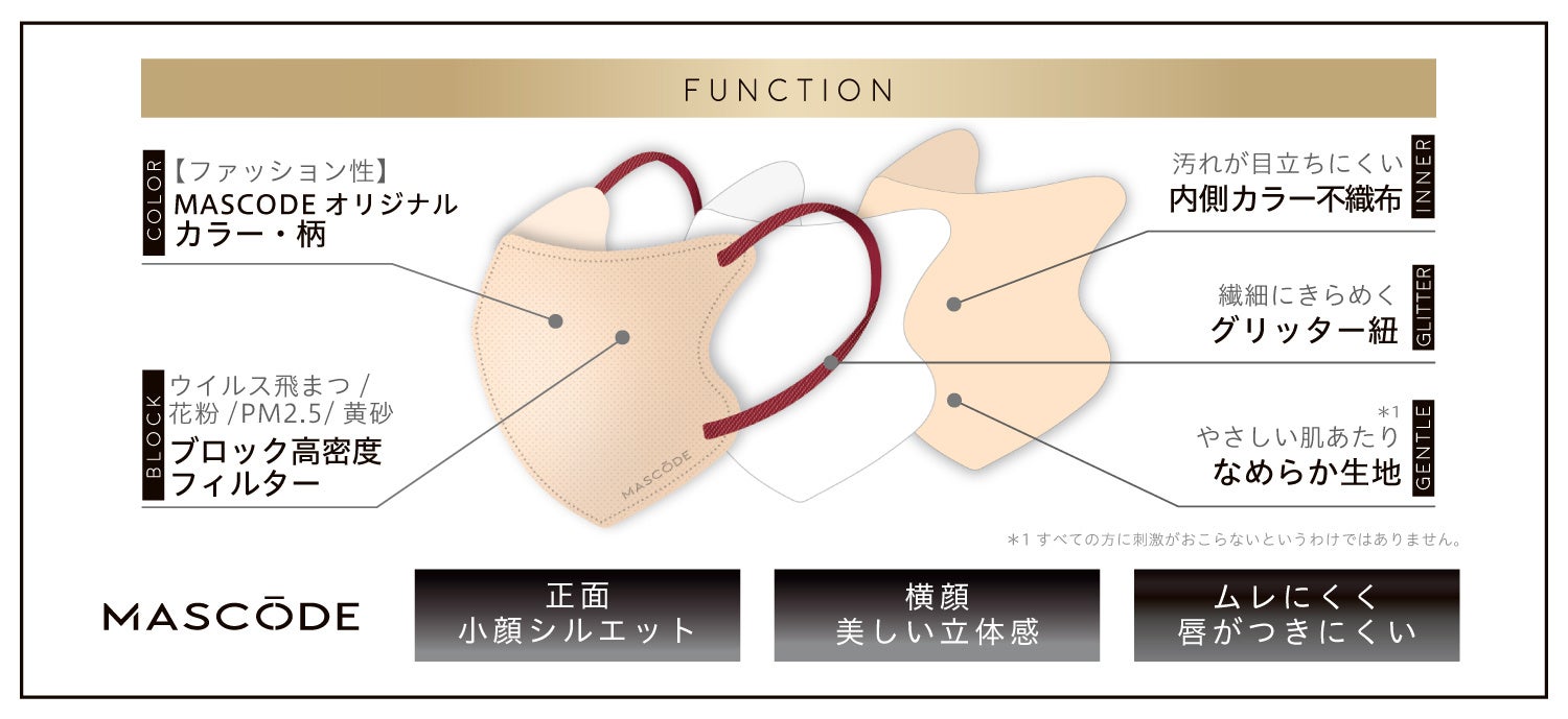 「MASCODE(マスコード)」は、ファッション性と機能性を両立させ、正面・横顔ともに美しく見える独自立体構造と高いデザイン性、シンプルなスタイリッシュさでハイクオリティなマスクスタイルを提案します。
