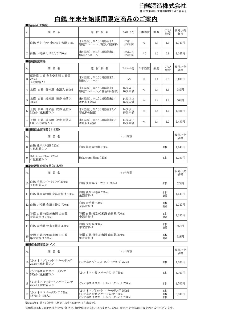 白鶴酒造株式会社は、年末年始の食卓を彩る期間限定商品を、2025年11月7日(金)から12月末まで全国で期間限定発売します。