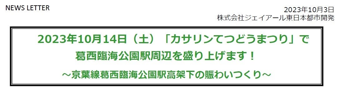 ジェイアール東日本都市開発では、心地よいくらしづくり、住みたくなるまちづくりの実現に向けて、その地域に暮らす、働く、関わる人々とともにくらしとまちに向き合っていく様々な試みを推進しています。この度、2023年10月14日(土)に、JR千葉支社京葉ベイサイドラインプロジェクトの皆さまと「カサリンてつどうまつり」へ協力いたします。京葉線葛西臨海公園高架下で、「でんしゃ縁日」や「こども制服記念撮影」「発車ベル操作体験・駅放送体験」等の盛りだくさんのイベントをおこないます。また、葛西臨海公園高架下ビル内のFfにもご協力いただき、10月6日(金)から10月15日(日)までFf1階催事コーナーにて「紀ノ国屋特別販売」も実施いたしますので、ご案内いたします。