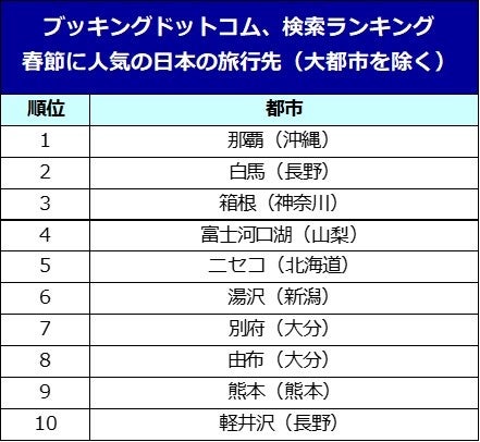 ブッキング・ドットコム、春節に人気の日本の旅行先(大都市を除く)を発表!スノーエリアや温泉地が人気!
