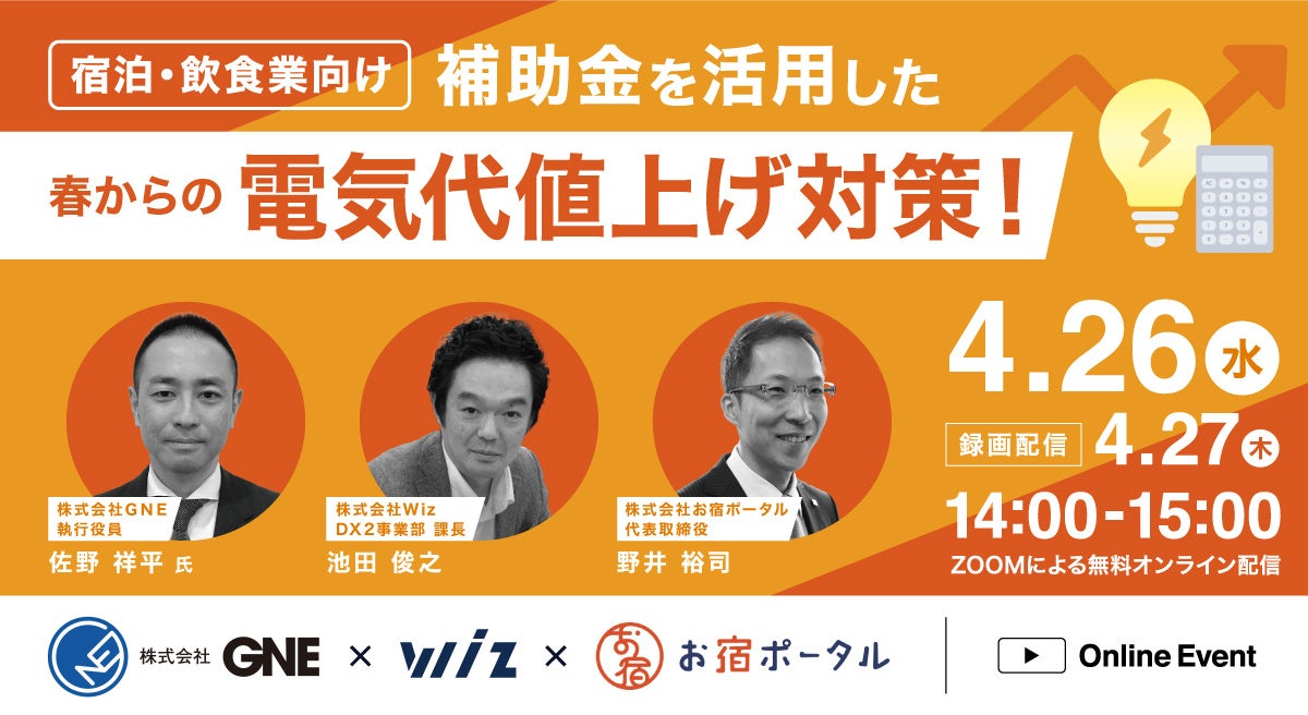 4月26日(水)、4月27日(木)※、株式会社Wiz・株式会社お宿ポータルは、【株式会社GNE 執行役員 佐野 祥平氏】をお迎えして、宿泊・飲食事業者向けに、値上がりの止まらない電気代を賢く削減する方法をお伝えするオンラインセミナーを開催します。