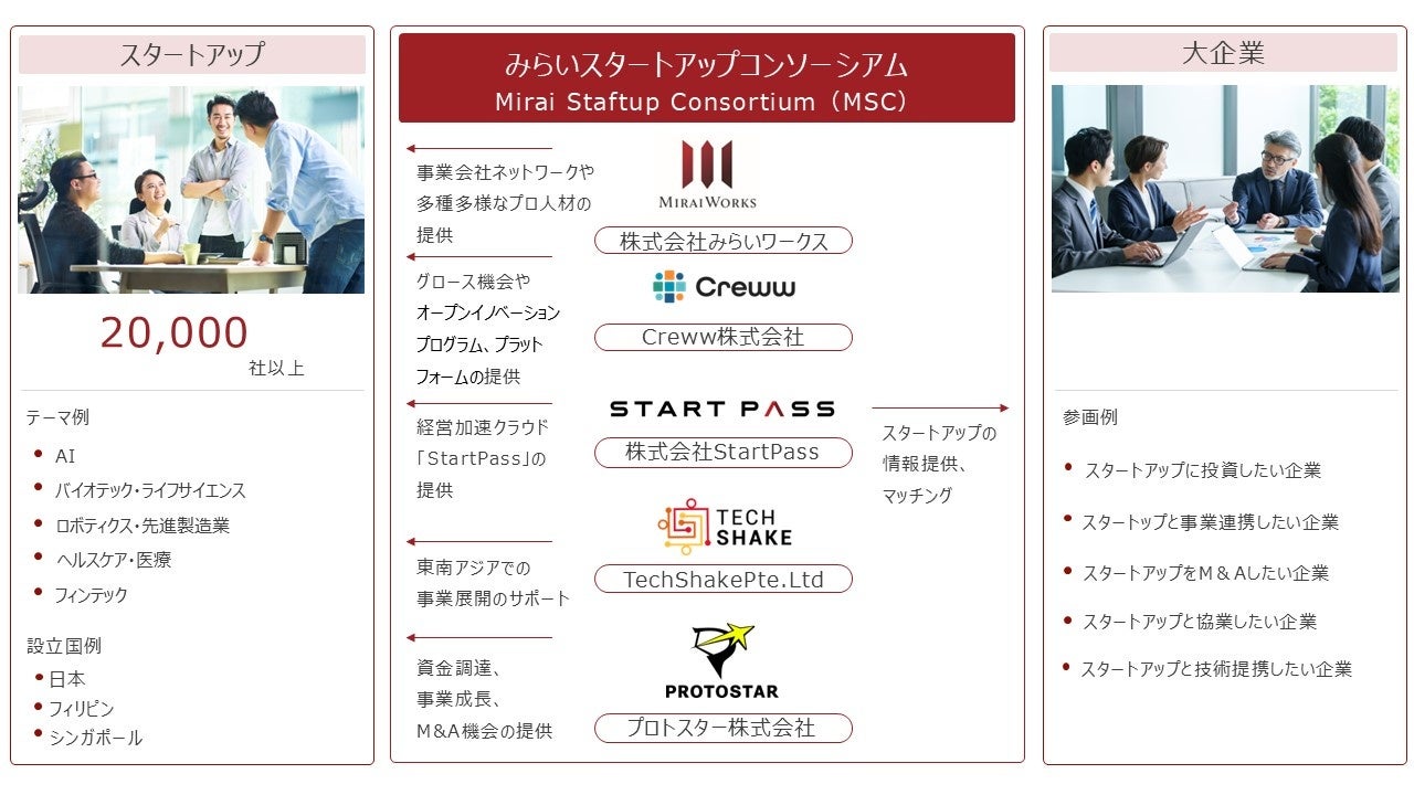 株式会社みらいワークス(本社:東京都港区、代表取締役社長 岡本 祥治、以下「当社」)は、Creww株式会社(本社:東京都渋谷区 代表取締役 伊地知 天、以下「Creww」)、株式会社StartPass(本社:東京都新宿区、代表取締役 小原 聖誉、以下「StartPass」)、TechShake Pte.Ltd(本社:シンガポール、代表取締役 足立 幸太郎、以下「TechShake」)、プロトスター株式会社(本社:東京都中央区、代表取締役 前川 英麿、以下「プロトスター」)、と業務提携し、スタートアップへの多面的なサポートをワンストップで提供することを目的とした「みらいスタートアップコンソーシアム」(Mirai Startup Consortium:MSC)を設立したことをお知らせいたします。
