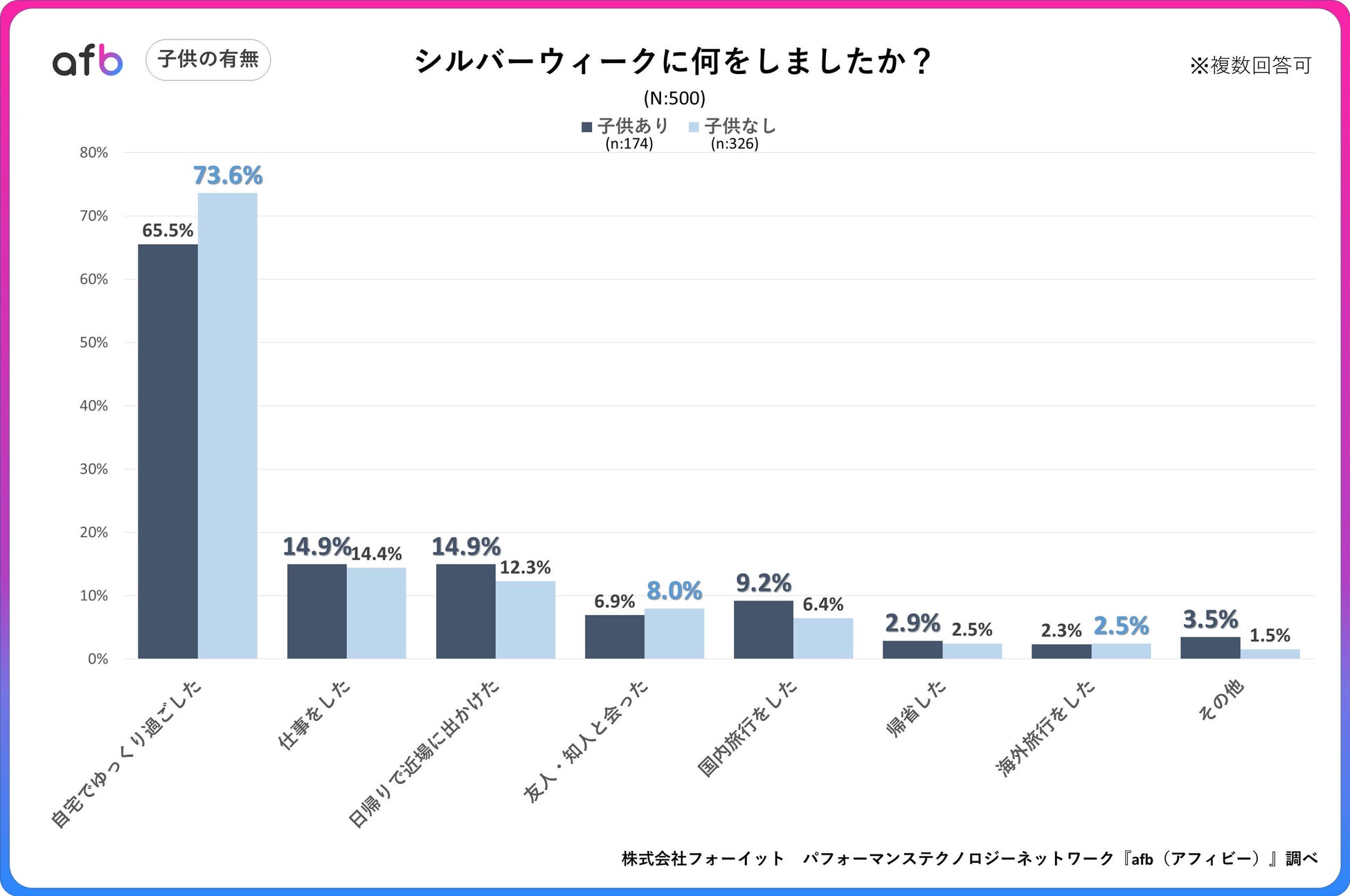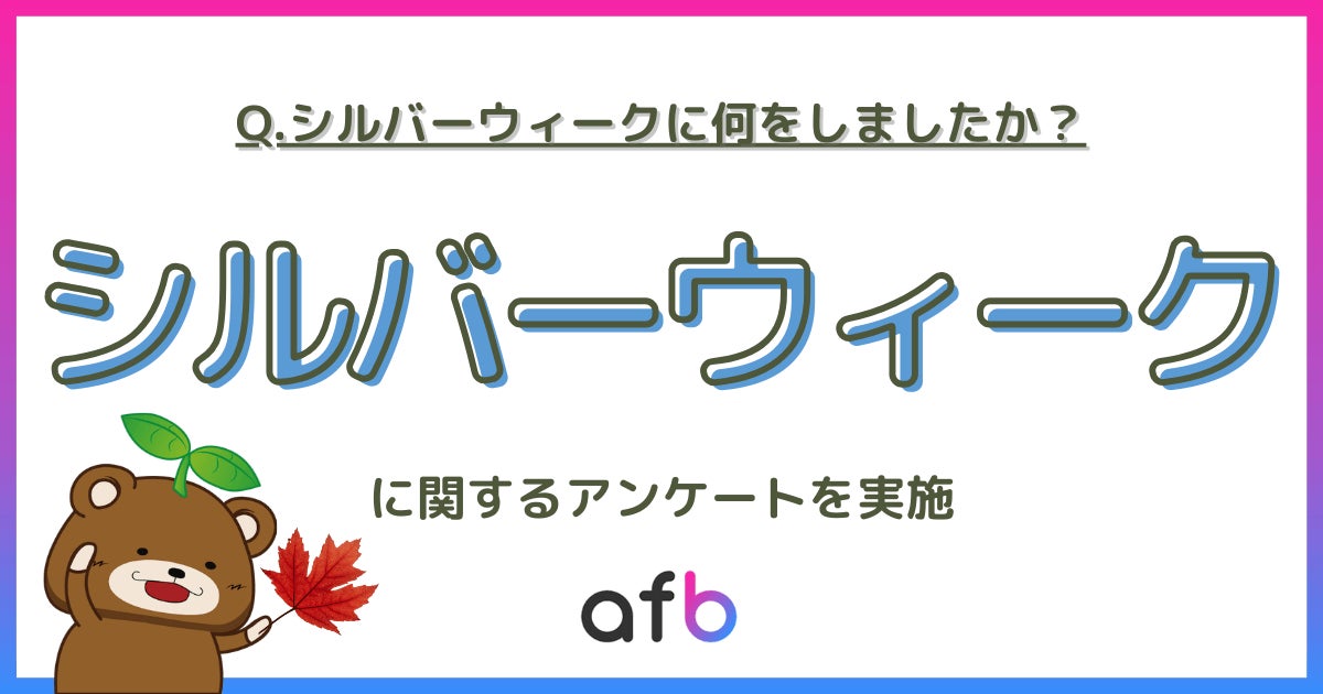 パフォーマンスマーケティングプラットフォーム「afb(アフィビー)」< https://www.afi-b.com/ >の開発運用をおこなう株式会社フォーイットは、全国の20歳~60歳までの男女500人を対象にシルバーウィークに関するアンケートを実施し、年代別等の特徴についてまとめました。