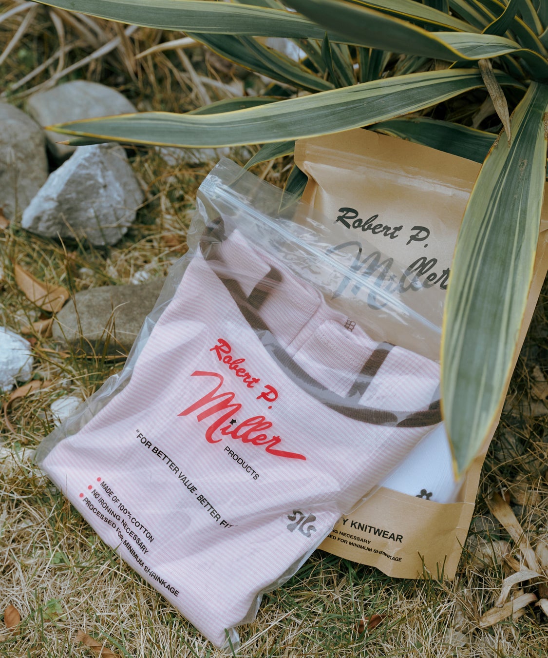 アメリカの老舗アンダーウェアブランド「Robert P. Miller」との初コラボレーションとなる今回は、ワンピース、タンクトップ、ブラトップの3アイテムを展開します。Robert P. Miller独自の針抜き仕様「PANEL RIB」を使用し、着るたびに馴染んでいく着心地の良さと、Lil Ambitionらしいカラー使いとシルエットにこだわりました。コラボレーションアイテムは、すべてRoberat P.Millerオリジナルのジップ袋に入れてお届けいたします。