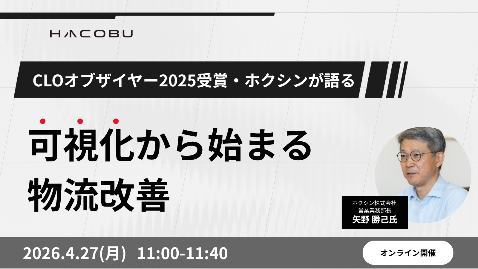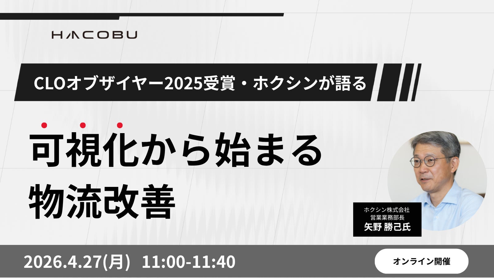 データの力で物流課題を解決する株式会社Hacobuは、2026年4月27日、「CLOオブザイヤー2025受賞・ホクシンが語る可視化から始まる物流改善」と題し、オンラインセミナーを開催いたします。