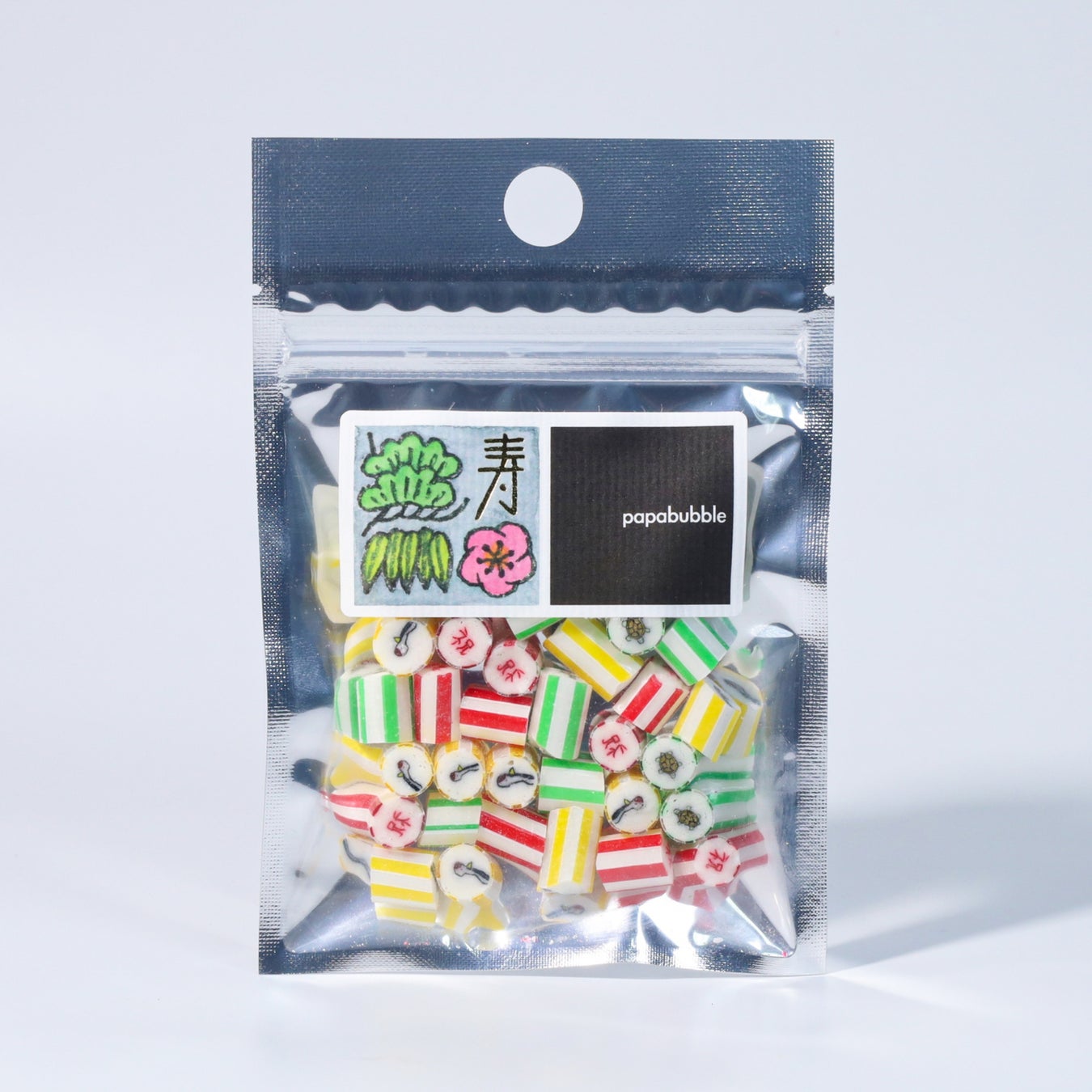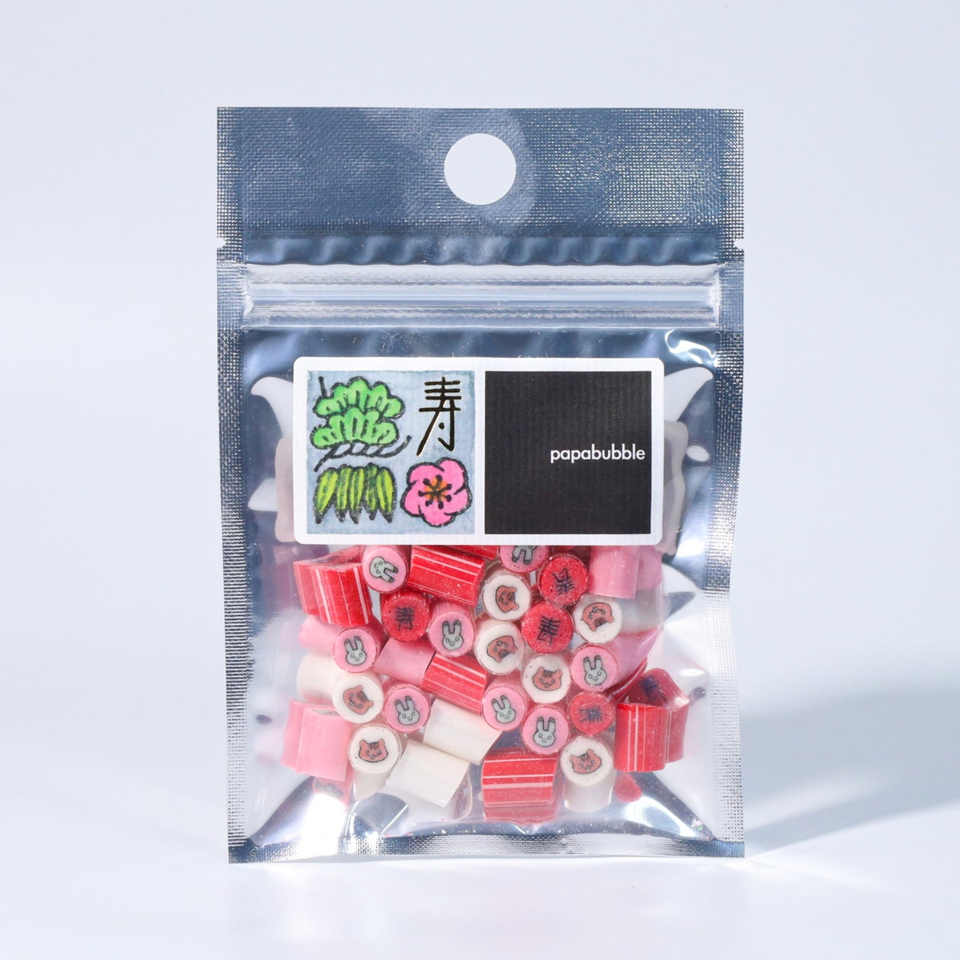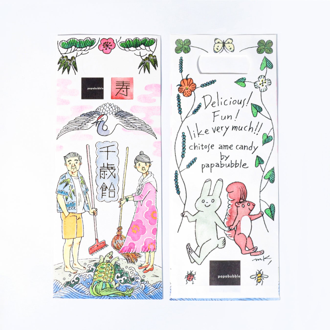 毎年大人気の、パパブブレの千歳飴がリニューアルしました。デザインは前回同様、鹿児島睦氏によるオリジナルパッケージで、お子様でも持ちやすいサイズ感で新たに作成しました。そのパッケージのモチーフからとった、可愛らしいうさぎとリスの「寿」、伝統的な長寿や繁栄の意味をもつ「鶴と亀」という2種類のデザインで、パパブブレの職人がお祝いの想いを込めて制作しています。「寿」にはいちごみるく・ぶどう・コーラ、「鶴と亀」にはパイン・もも・さくらんぼという、お子様に人気のフレーバーをそれぞれ使用。お子様の成長を願うプレミアムな千歳飴は贈り物にも最適です。さらに今年は、お気軽に千歳飴をお楽しみいただけるようBAGタイプもご用意しています。