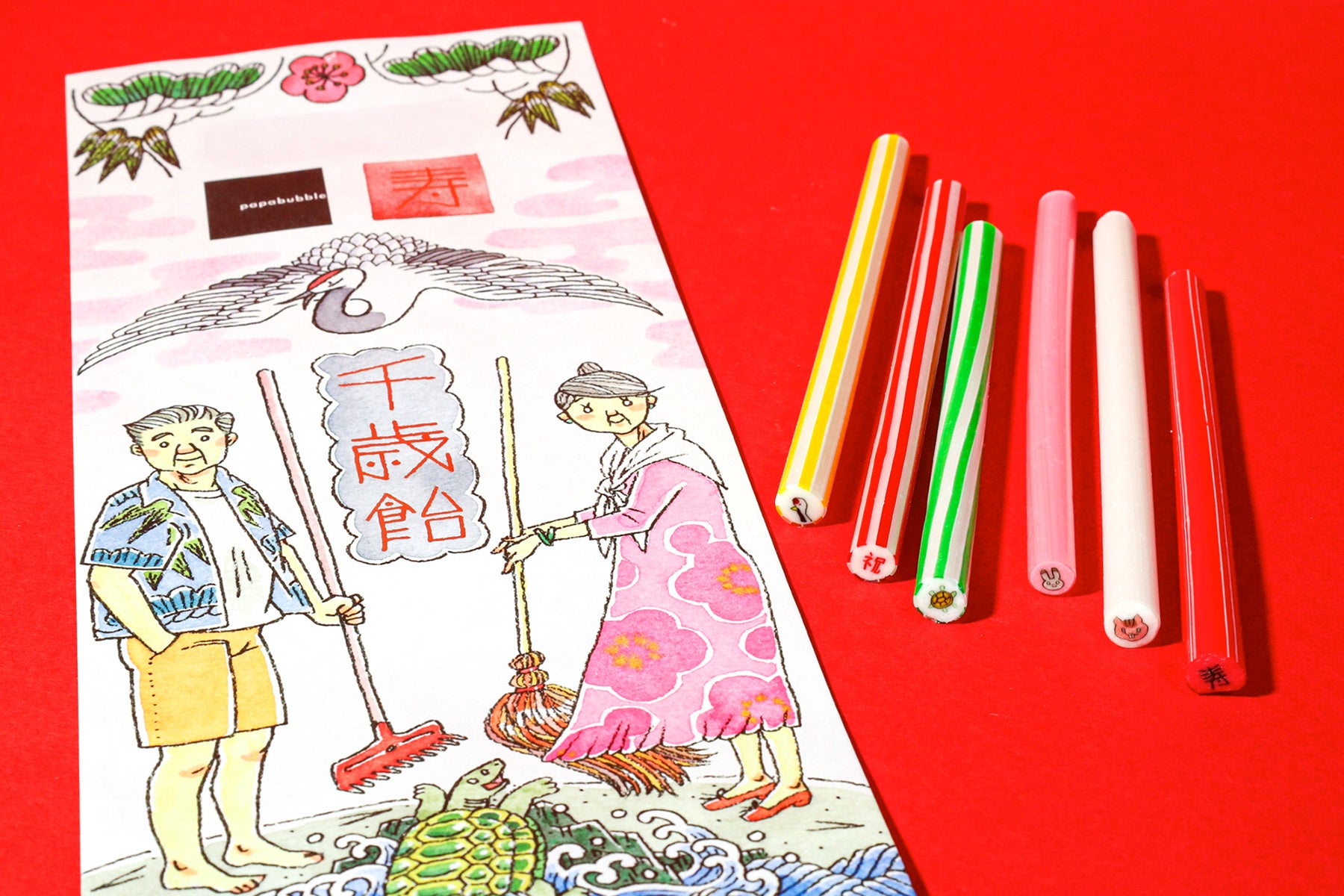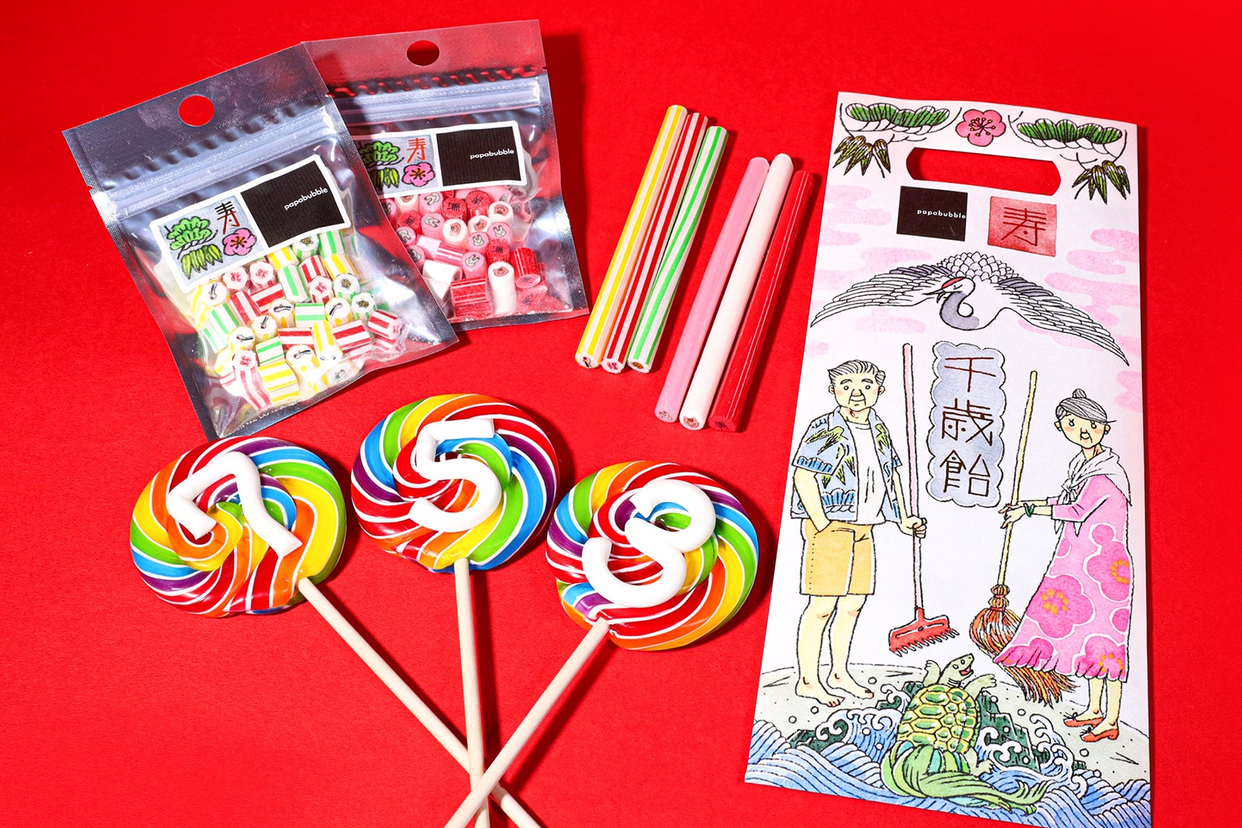 Craft Candy Theater「PAPABUBBLE/パパブブレ」は、毎年定番の七五三キャンディを鹿児島睦氏デザインでリニューアル。さらに、お祝いの撮影にもぴったりな数字が入ったレインボーロリポップを、10月10日(木)より全国店舗及びパパブブレ公式サイト(https://papabubble.co.jp/collections/chitoseame)にて発売開始いたしました。