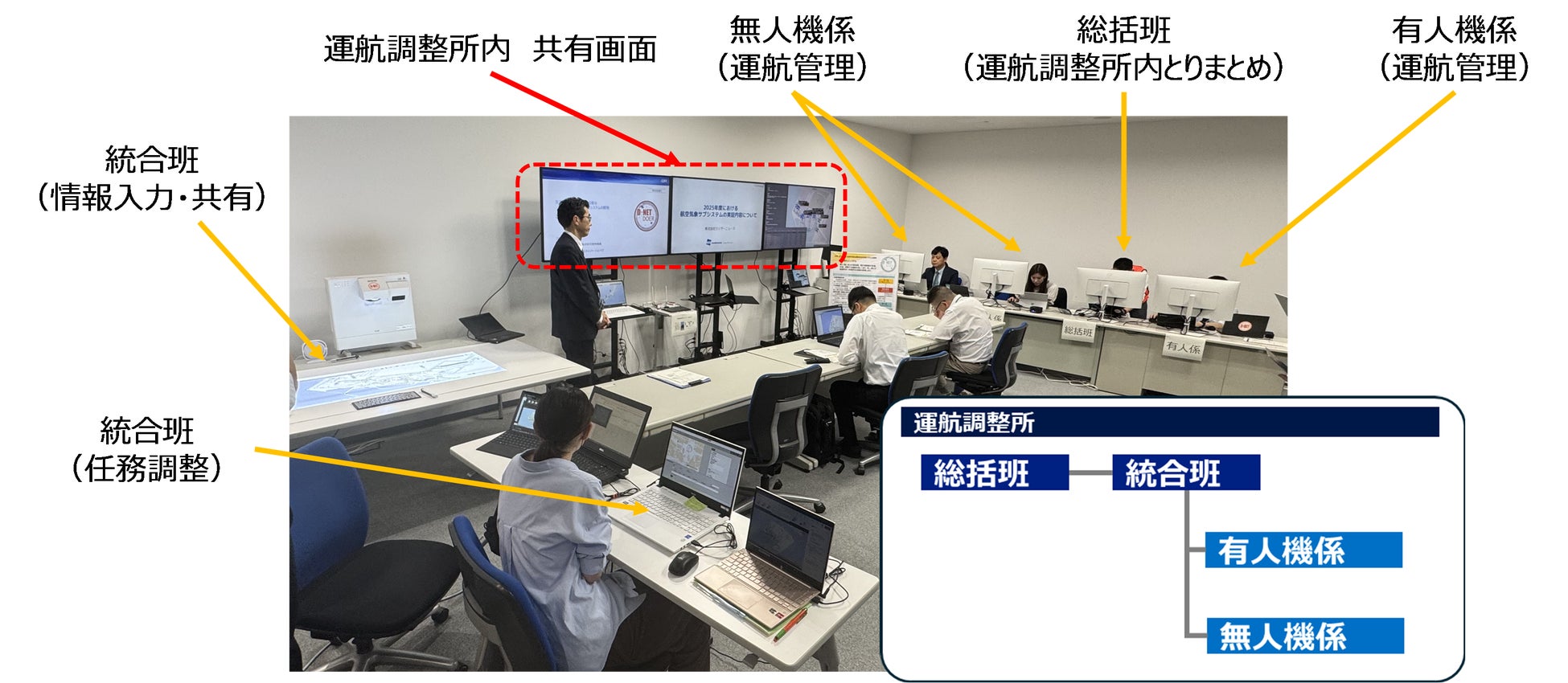 運航調整所において、飛行前日の調整、飛行当日の運航監視、飛行当日に発生した緊急任務を有人機・無人機に割り当てる対応(任務割当)等をシナリオに基づいて行いました(図1、図2)。