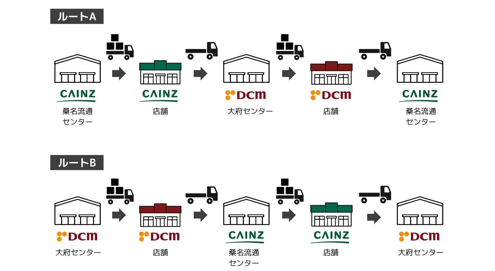 ・概要:DCMとカインズはそれぞれの物流センターから自社の店舗へ納品後、空車のまま、自社の物