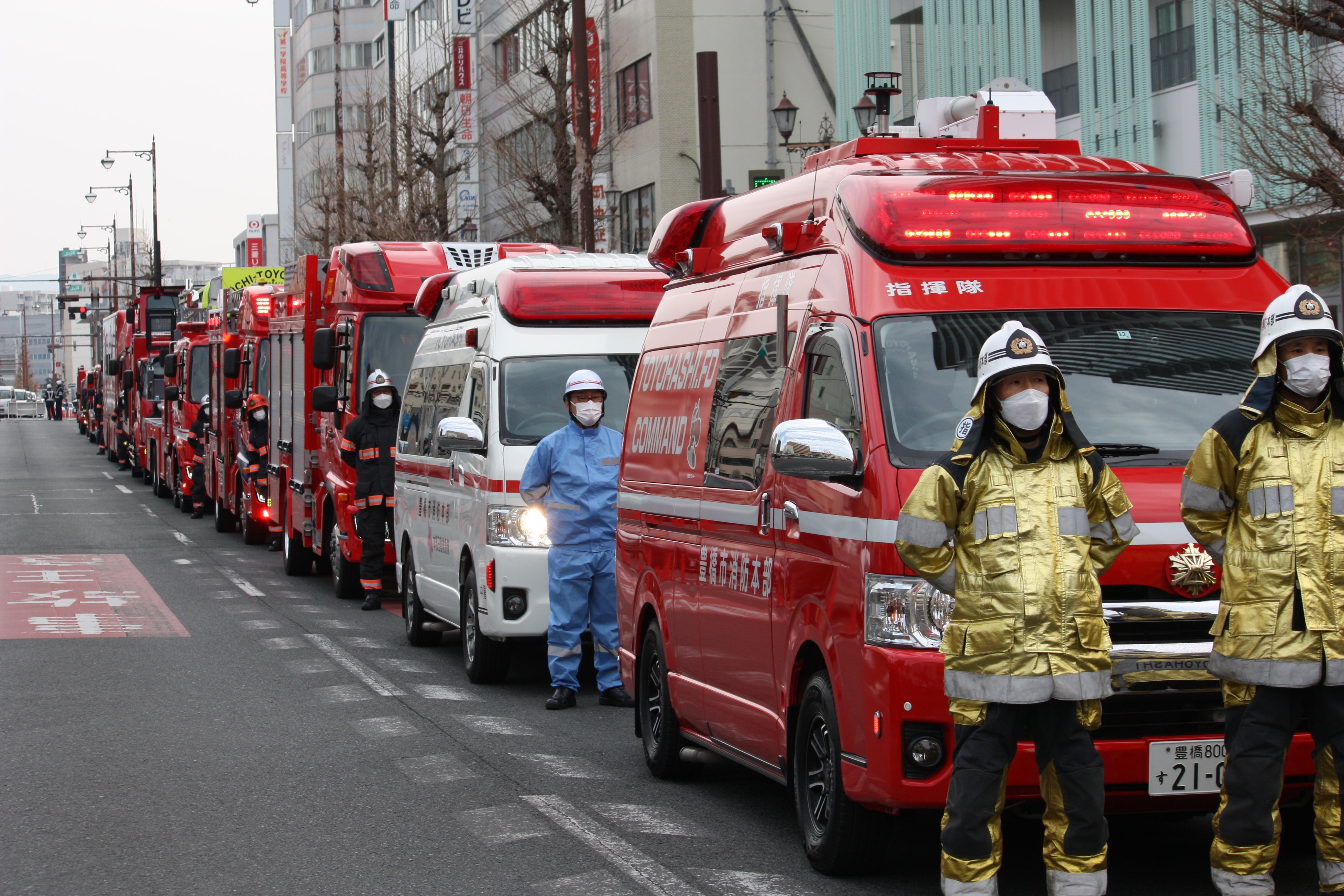 「消防を身近に感じてほしい」という思いから、2024年は、さらに内容を充実させて1月6日(土)に開催します。午前10時から式典がまちなか広場で始まり、浅井由崇市長が消防職員や消防団員らの徒歩部隊を観閲。続いて、駅前大通りの約140メートルに並んだ消防車など機動部隊を観閲します。