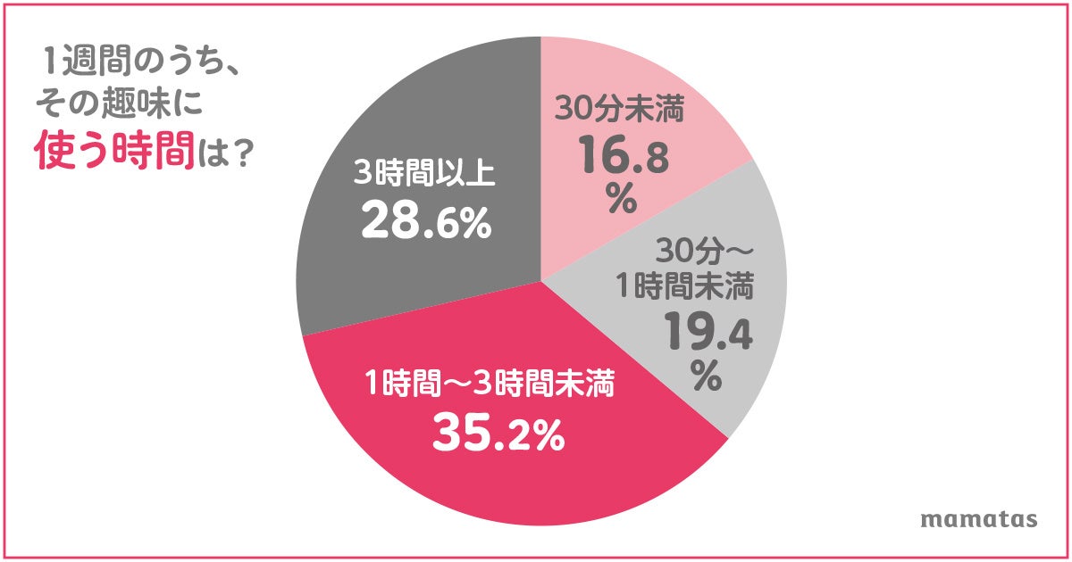 - 週3時間以上、趣味に時間を割いているママは28.6%。月額1万円以上費やしている人は19.7%。