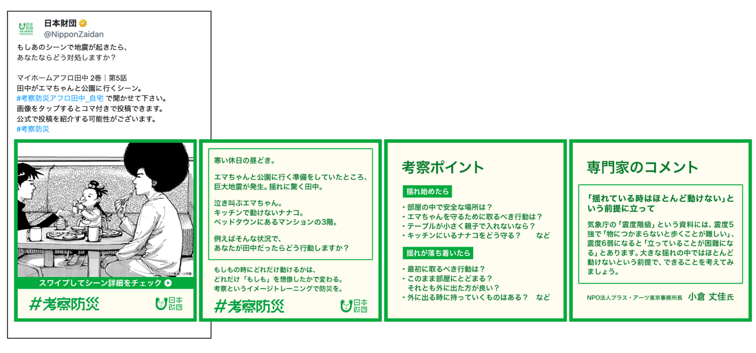 過去の活動から得た最大の教訓は、「災害対策は起きてからでは遅い」ということです。「#考察防災」を実施するXは、東日本大震災から災害時の情報手段としても大きな役割を果たしていました。一方で、多くの漫画ファンがX上でストーリーの中にある手がかりからその後の展開を予測したり、想像力豊かに考察することで盛り上がっています。そこで、親しみのある漫画作品を入り口に、体を動かさなくても参加できる「避難訓練」として、平時の備えを見つめ直す機会としていただきたいと考えています。