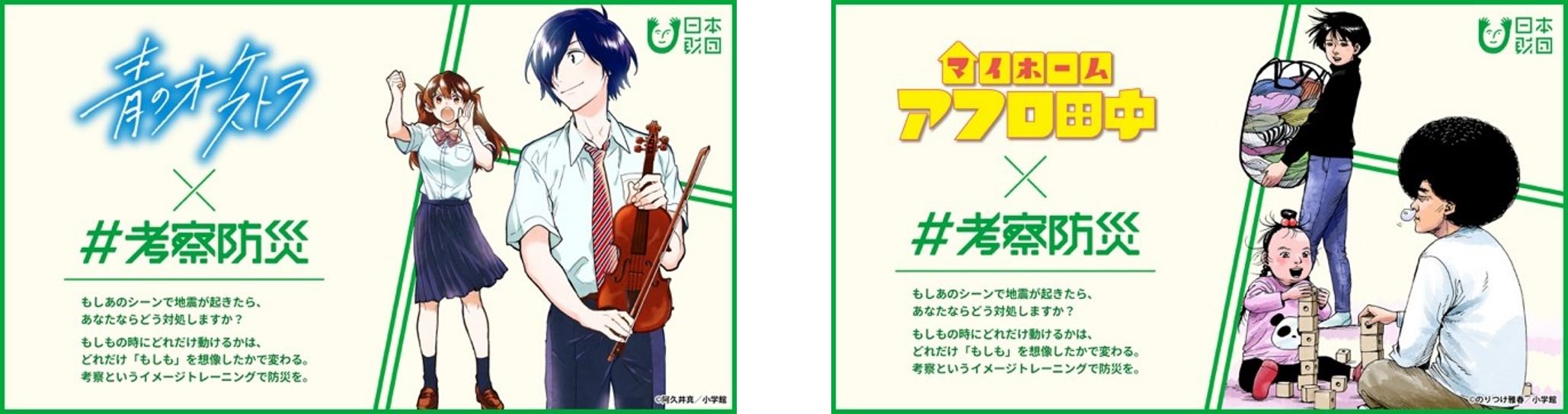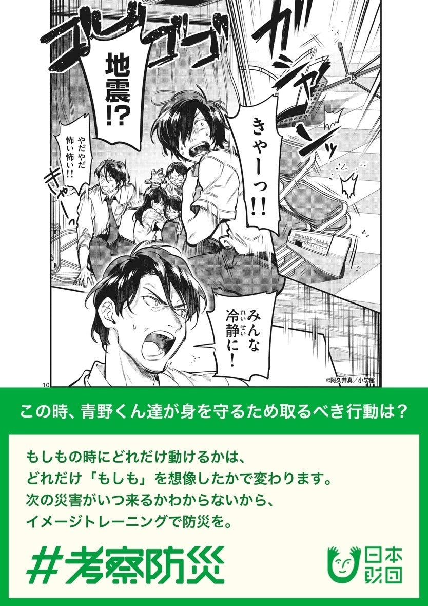 本キャンペーンは、国内に実際にある土地が舞台となっている『青のオーケストラ』(作:阿久井真)および『アフロ田中』(作:のりつけ雅春)の2作品とのコラボで、今回のために作者さまが描き下ろした「もしも漫画」および読者参加型の「考察コマ」で構成されます。8日に公開する「もしも漫画」では、作中の実際のシーンから分岐する形で、地震が発生したもしもの世界が描かれます。その後、3月末までに5種類の「考察コマ」を公開予定です。防災の専門家のコメントとともに、両作品中のあるコマを掲示し、その場面で災害が発生した場合どう対処すべきか、読者にイメージトレーニングを促します。