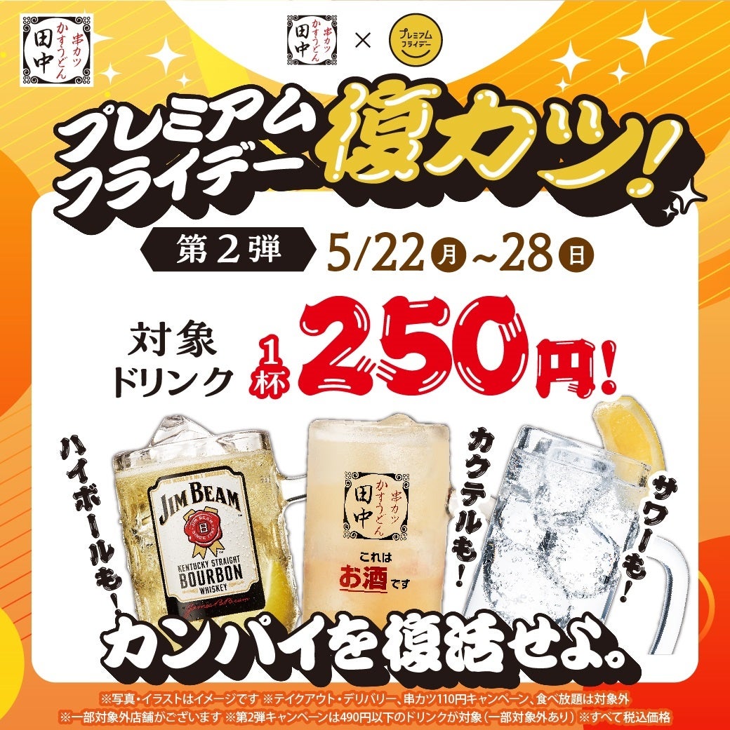 コロナ禍により外食をする機会が減少したことで、お客様が笑顔で「乾杯!」をすることも少なくなりました。今回プレミアムフライデーを復カツさせることで、もう一度お客様の笑顔を、そして「乾杯!」を復活させたいという考えから、この期間中は店内ご利用のお客様全員、対象のドリンクを一杯250円で提供します。より多くのお客様が串カツ田中でのひとときを楽しく過ごし、新たにファンになっていただくためのプレミアムな企画なので、この期間に是非お越しください。