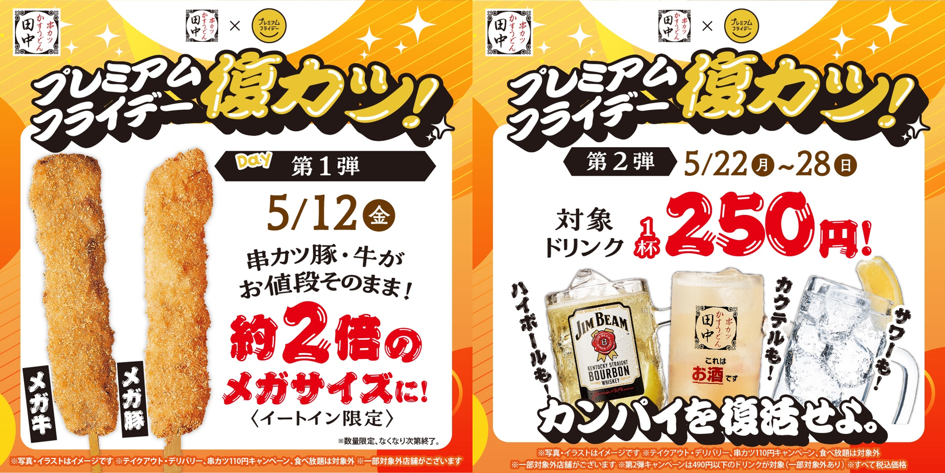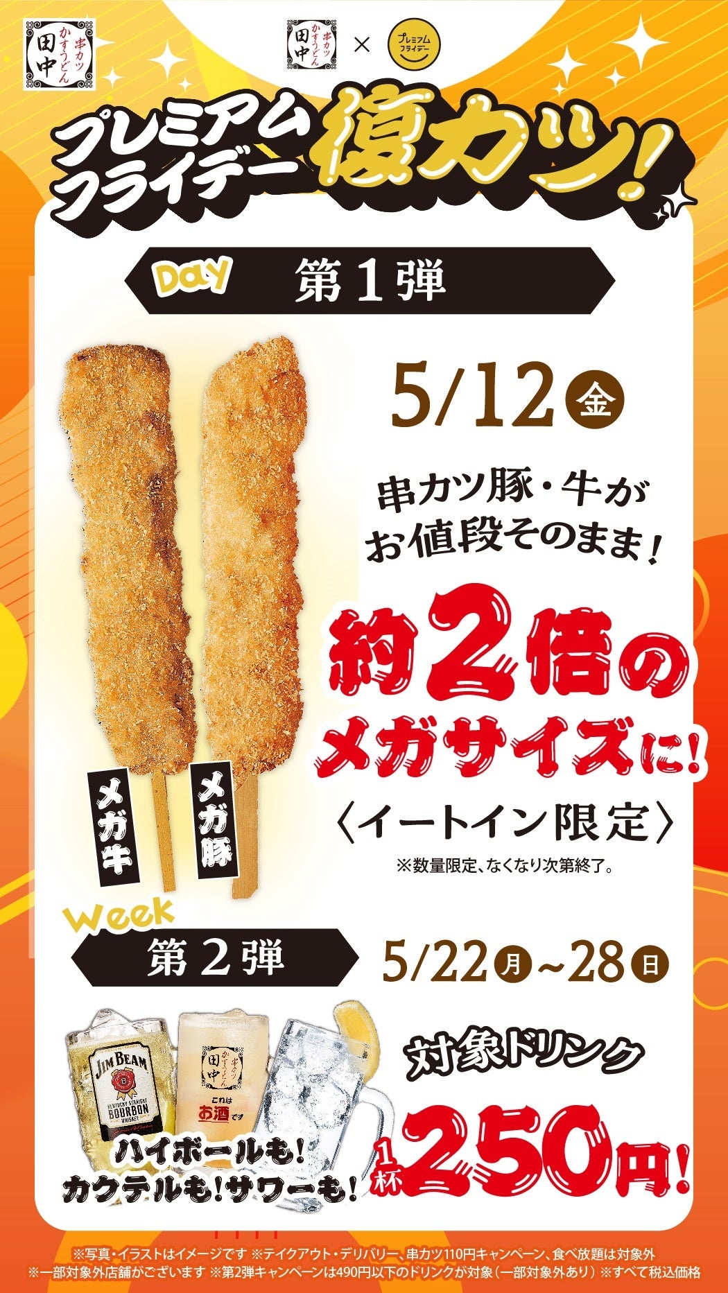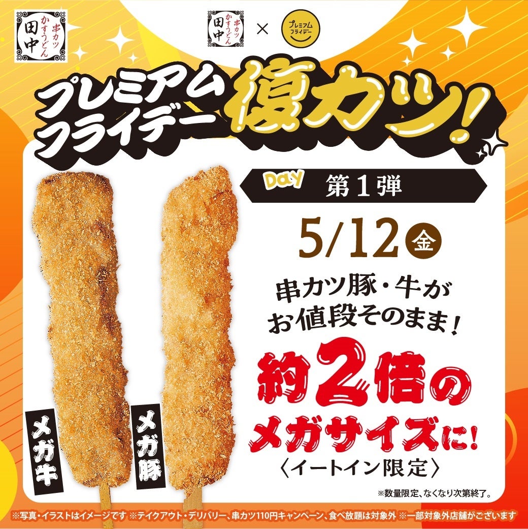 プレミアムフライデー“復カツ”を記念して2種類のキャンペーンをおこないます。第1弾は5月12日(金) の単日限定で人気No.1の「串カツ豚」と、人気No.2の「串カツ牛」をお値段そのままに“メガサイズ”で提供します。