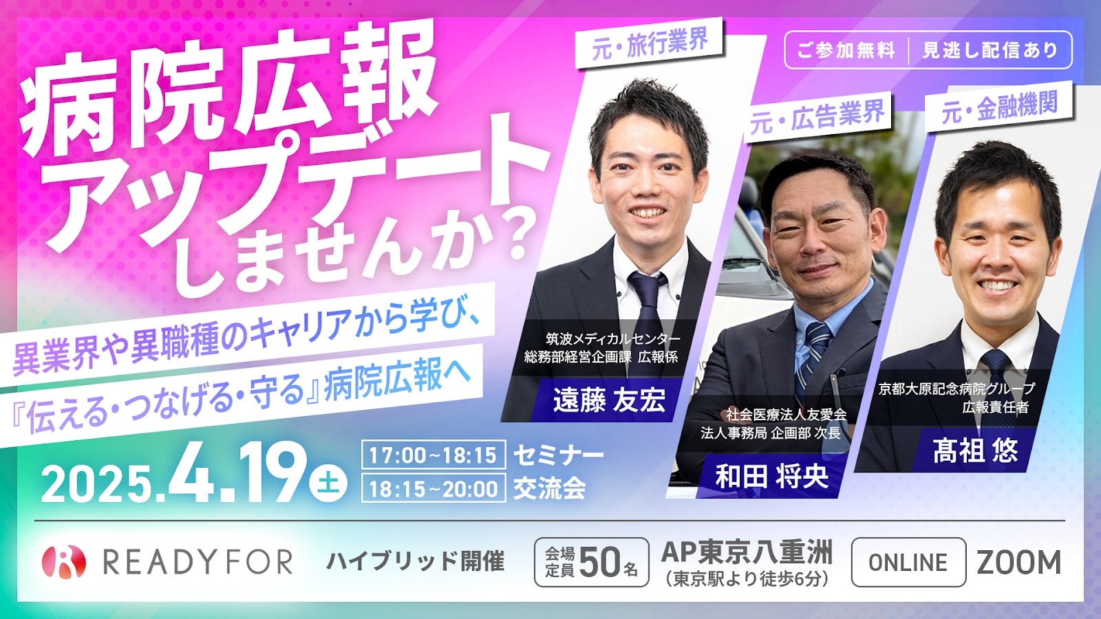 日本初・国内最大級のクラウドファンディングサービス「READYFOR」を運営するREADYFOR株式会社は、2025年4月19日(土)にイベント「病院広報アップデートしませんか?-異業界や異職種のキャリアから学び、『伝える・つなげる・守る』病院広報へ-」を開催いたします。なお本イベントは、当社医療部門で初となる会場開催イベントで、会場ではセミナー後に病院様同士の交流会も実施いたします。オンラインでも参加いただけますので、ぜひ奮ってお申し込みください。