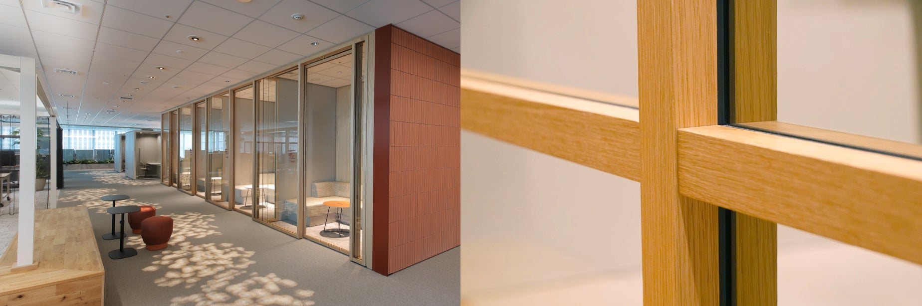 建築物の木造化・木質化に追随する内装の木質化に応え、居心地の良い空間を演出する突板仕上の不燃パーティションです。