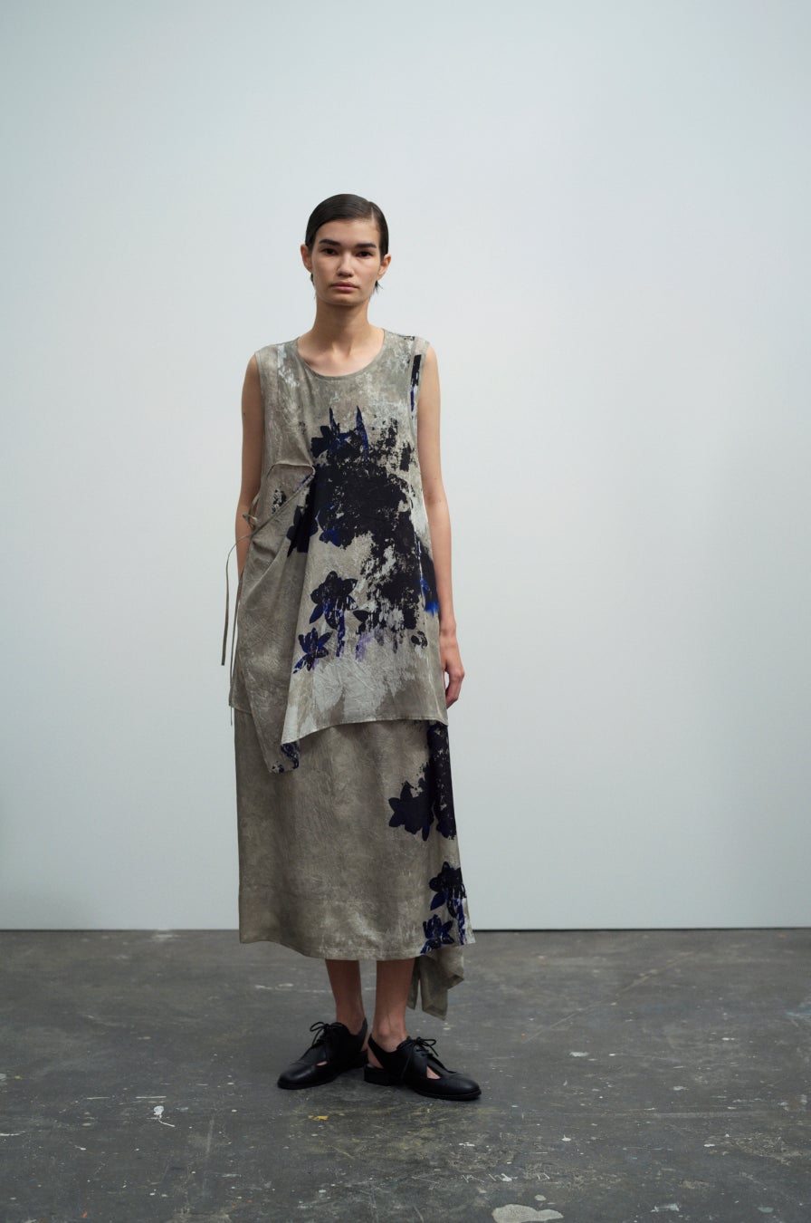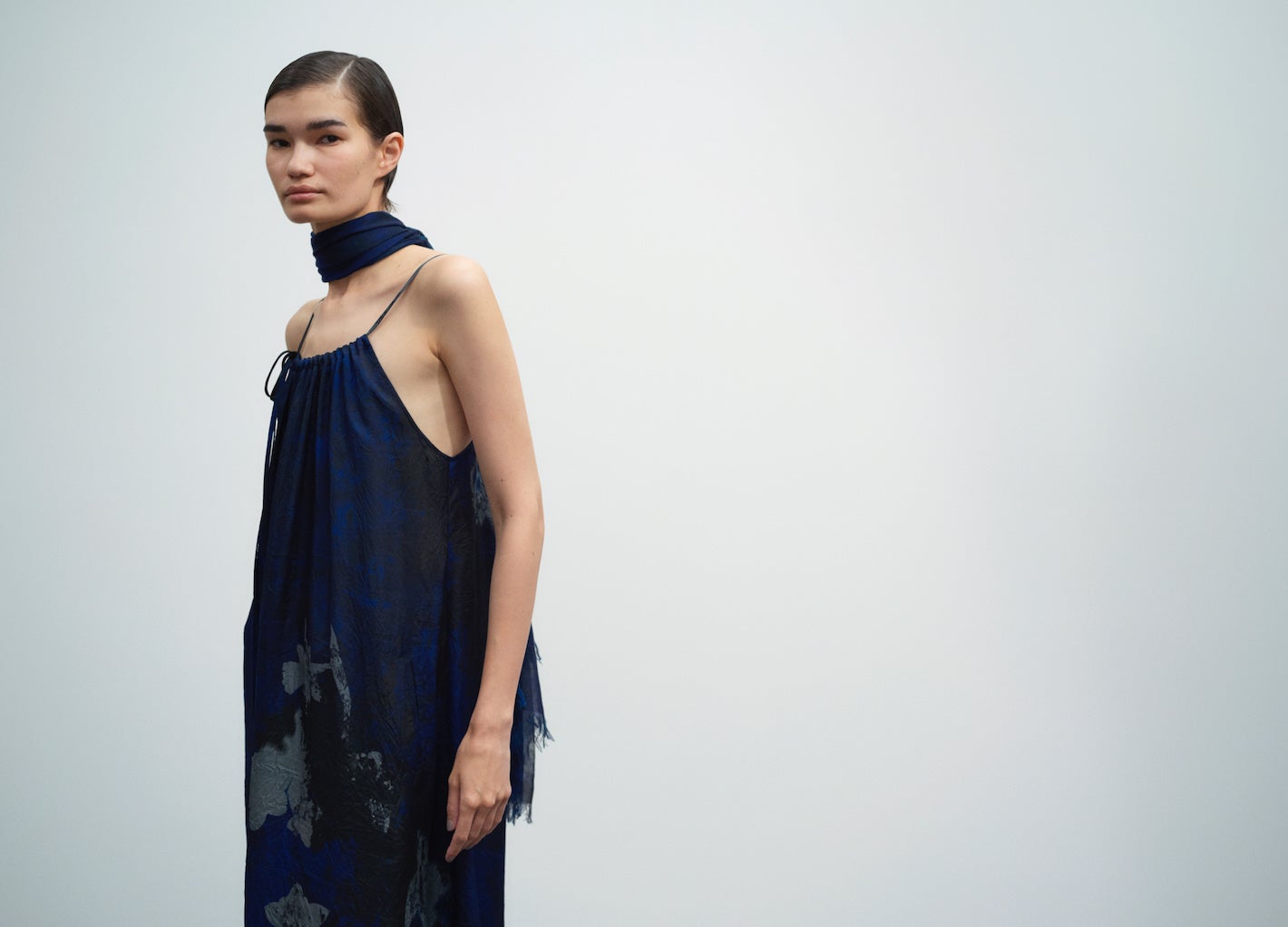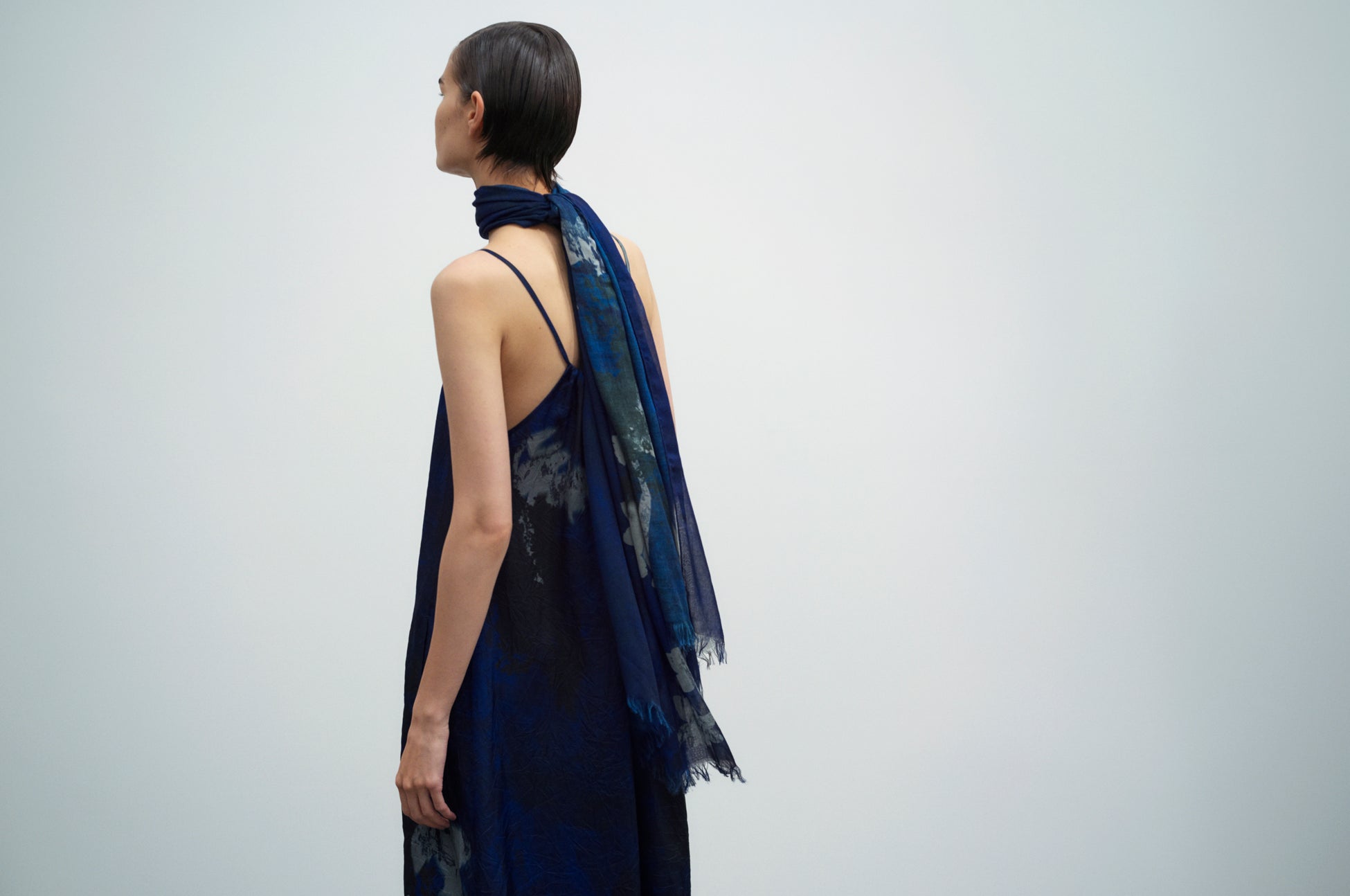 水仙のプリントグラフィックで構成されたドレスは、首元をジュエリーではなくストールで飾り、Y'sらしいリゾートスタイルを完成させています。