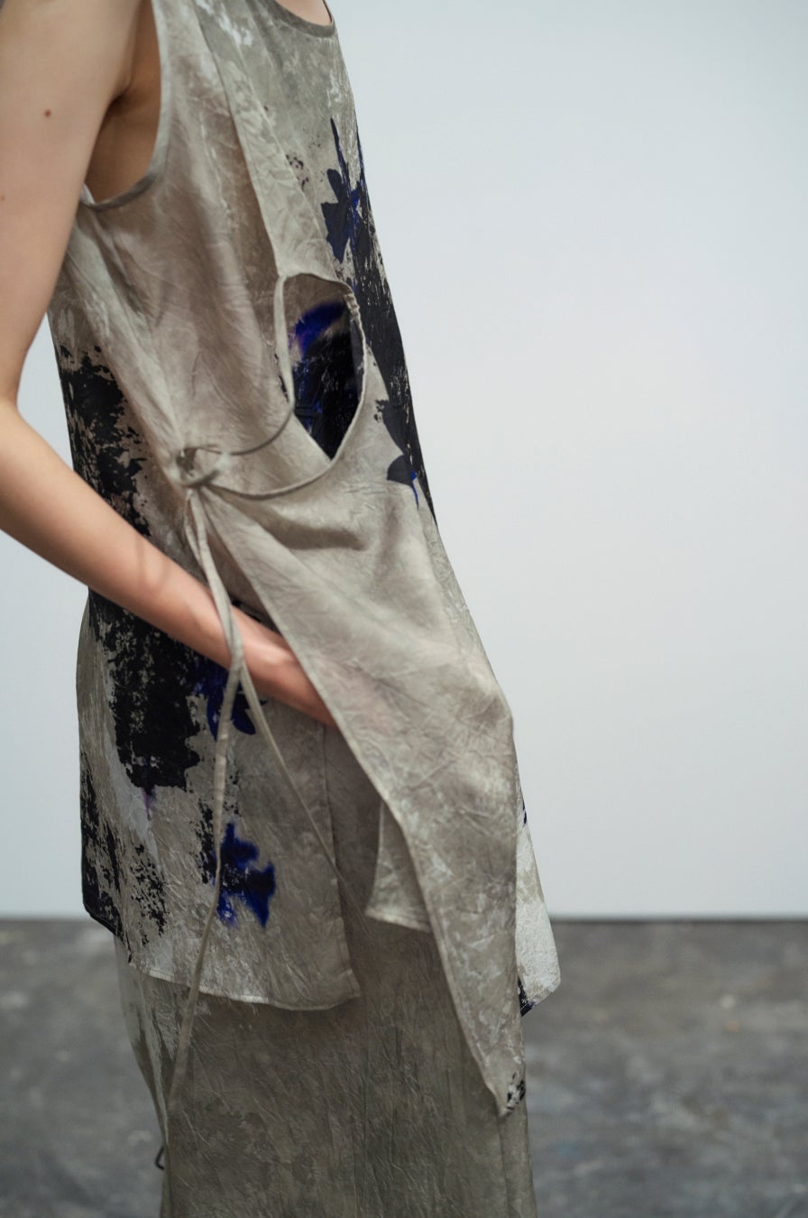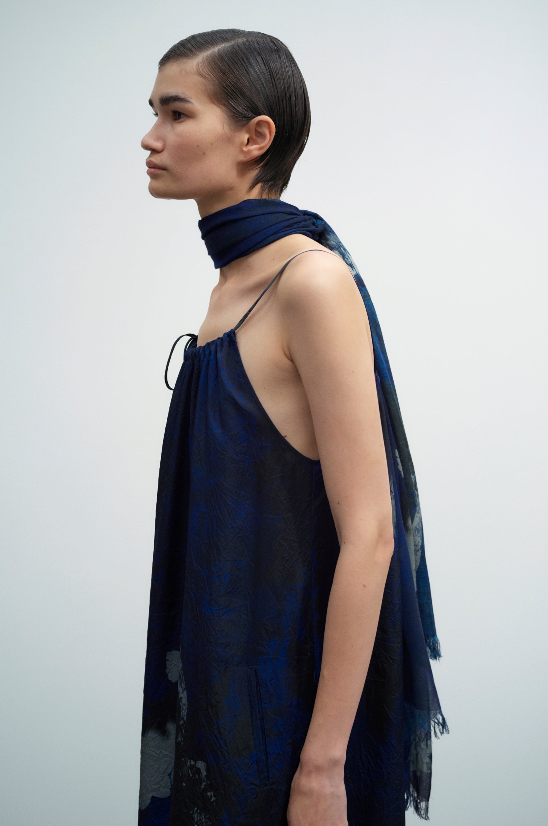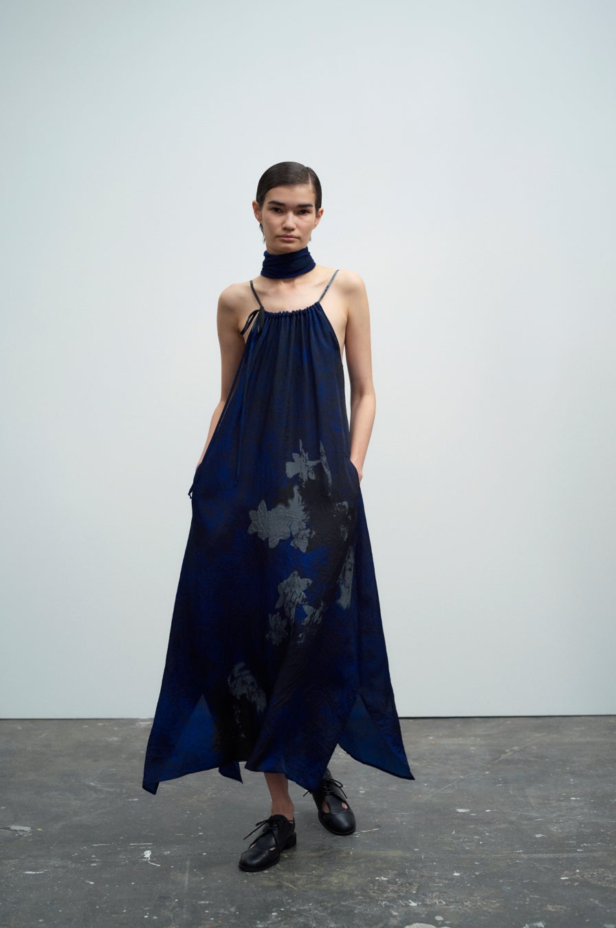 水仙のプリントグラフィックで構成されたドレスは、首元をジュエリーではなくストールで飾り、Y'sらしいリゾートスタイルを完成させています。