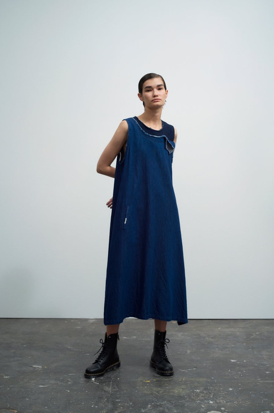 素材そのものの質感が、断ち切りで服の表情に取り入れられたデニムのピース──ダメージ部分の補修跡がそのままの着慣れた服のようなディテールをハンドステッチで表現したデニムウェア。