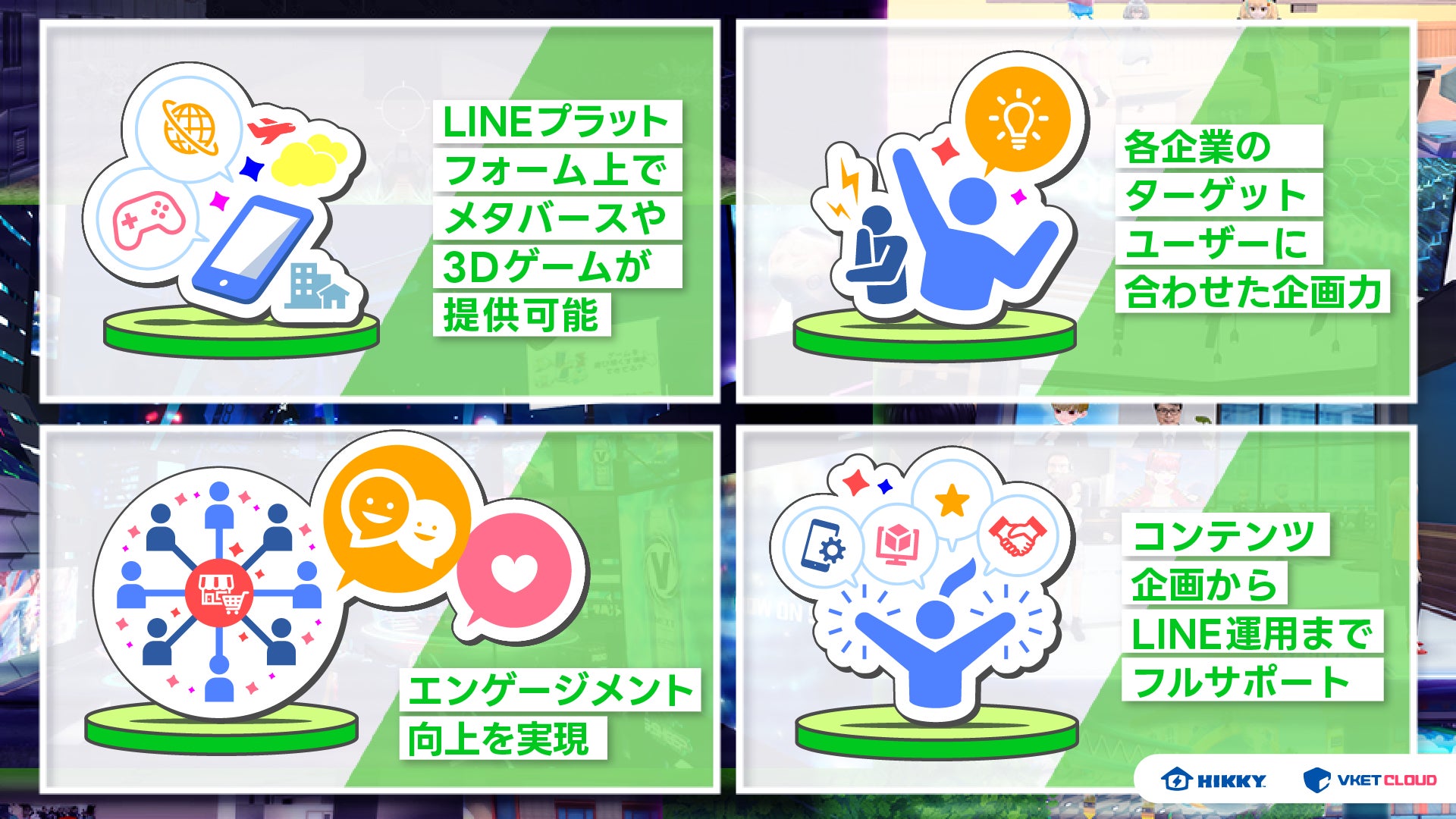 また、本サービスの開始に伴いHIKKYは、数々のメタバースイベントやコンテンツを企画運用してきたノウハウを活かし、Vket Cloudで提供される体験型コンテンツを活用したLINE公式アカウントの設計、セットアップから集客、運用までを一気通貫してサポートするLINE公式アカウント運用ソリューションをご提供します。