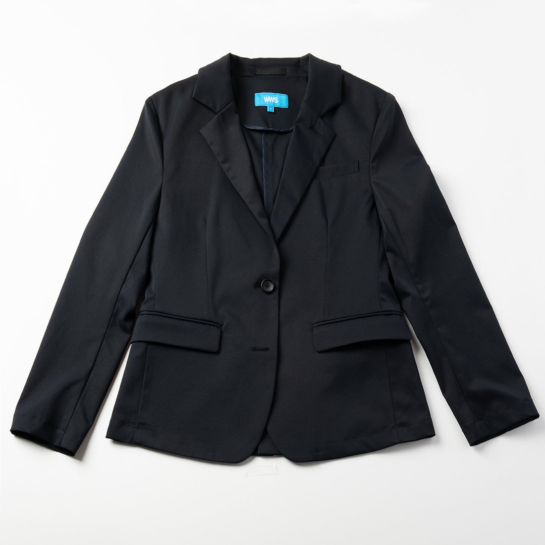 特 徴:ビジネスシーンにマッチする、程よく立体的ですっきりとしたテーラードジャケット。2つボタンで胸元に綺麗なVゾーンを作り、ウエストの絞りを抑えることで縦ラインが強調され、シルエットが綺麗に見えます。
