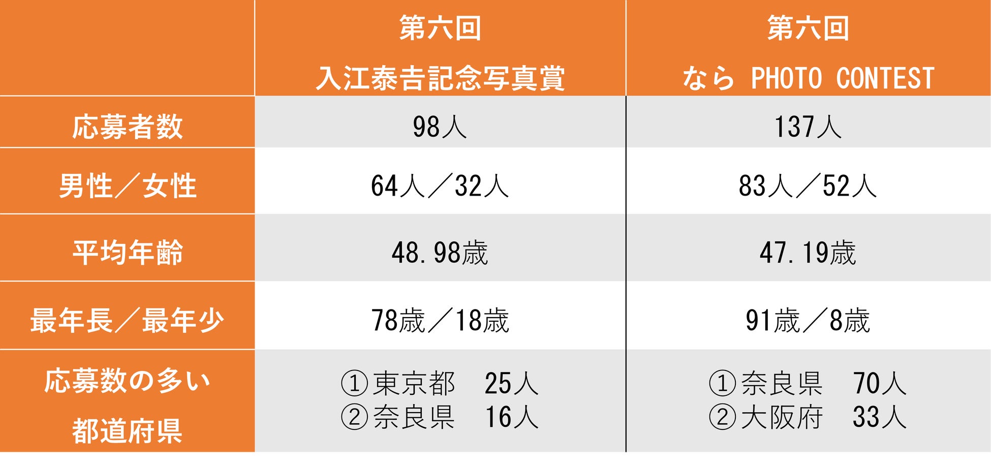 今回の応募から、オンラインでの応募に切り替え、写真データでの審査も導入した。オンライン化により、前回に比べ入江泰𠮷記念写真賞は応募作品数が約1.6倍に増加(前回61作品→今回98作品)。ならPHOTO CONTESTは応募者の平均年齢が10歳低くなる(前回59.98歳→今回47.19歳)という新たな傾向も見られた。