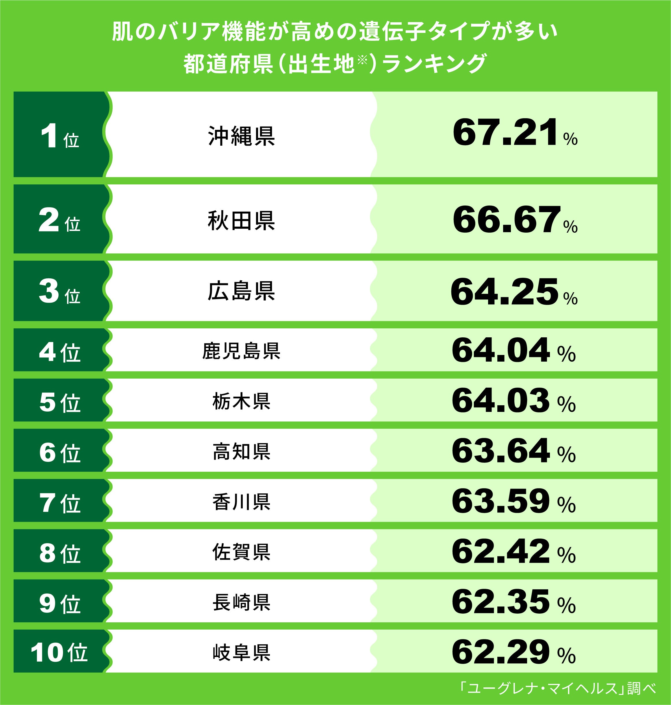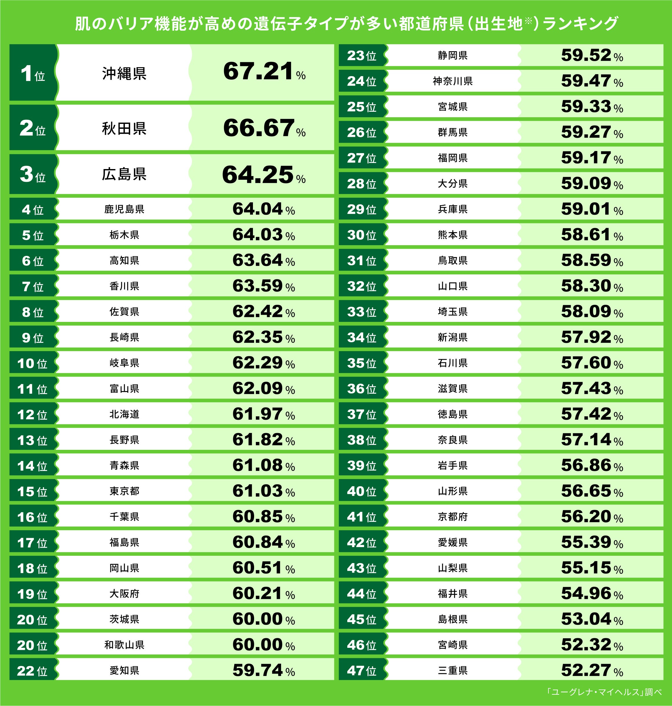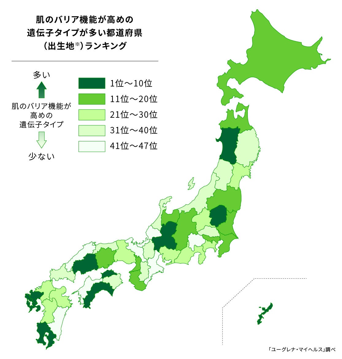 株式会社ユーグレナ(本社:東京都港区、代表取締役社長:出雲充)は、ユーグレナ・マイヘルスとジーンクエストの遺伝子解析サービスのゲノムデータをもとにした、「肌のバリア機能が高めの遺伝子タイプが多い都道府県(出生地※)ランキング」を公開いたします。