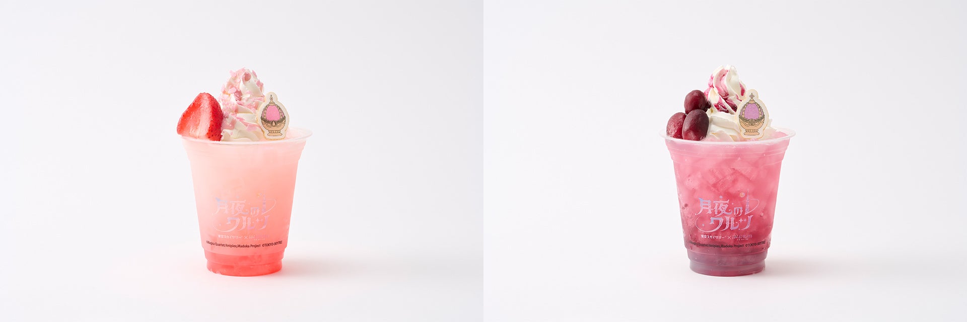 暁美ほむらをイメージしたドリンク。りんご風味の紫ゼリーとぶどうソーダに、ブルーベリーソースとぶどうの果実をトッピング。