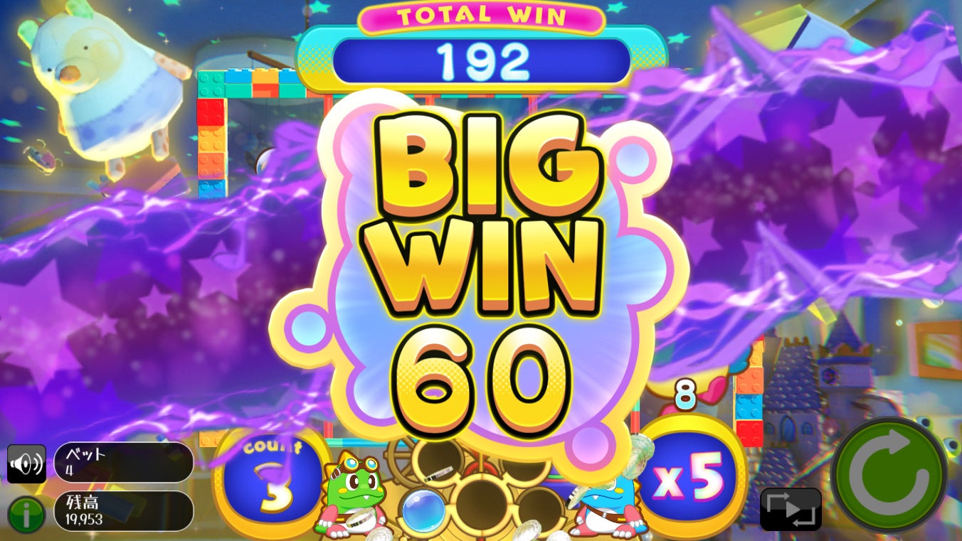 かわいいタイトーキャラたちが活躍するデジタルスロットです。レインボーバブルが3つ以上揃うとボーナスゲームに突入、大量のメダルを獲得できます。