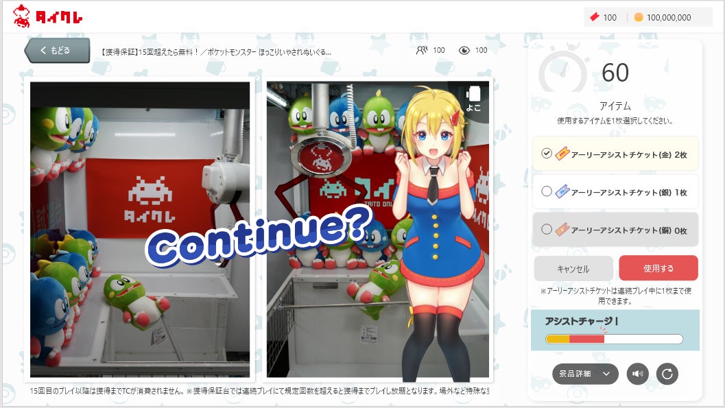 「タイトーオンラインクレーン(タイクレ)」は、登録者数390万人を突破した、いつでもどこからでもPCやスマートフォン、タブレットから本物のクレーンゲームを遠隔でプレイすることができるサービスです。景品はぬいぐるみやフィギュアなどアミューズメント施設を超える圧倒的な品揃えが特徴で、更にはタイクレ限定プライズも毎月多数登場。一定回数以上プレイいただいても景品を獲得できない時はスタッフが景品を移動し獲得をお手伝いする「アシストサービス」を実装しており、お客様よりご好評をいただいております。Webブラウザ版をはじめ、App Store版、Google play版、Yahoo!ゲーム版にてお楽しみいただけます。