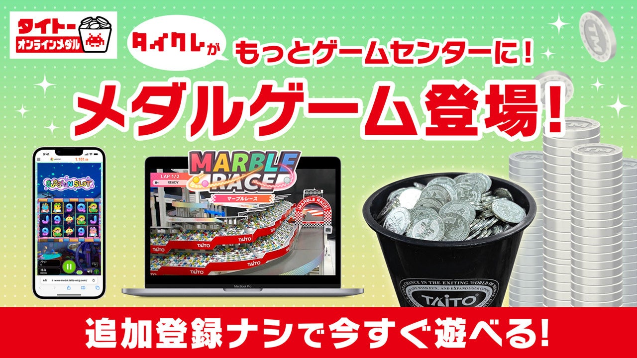 本メダルゲームはタイクレWebブラウザ版の「タイトーオンラインメダル」にてプレイ可能で、タイクレのプレイ待ち時間にもお楽しみいただけます。また、ゲームセンターのリアルな興奮をさらに体験いただけるよう、新たなコンテンツの拡充や獲得したメダルによる特典のご用意も今後予定しております。