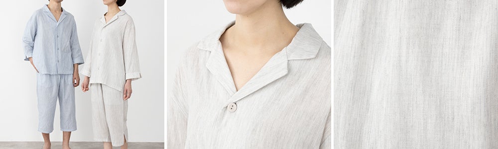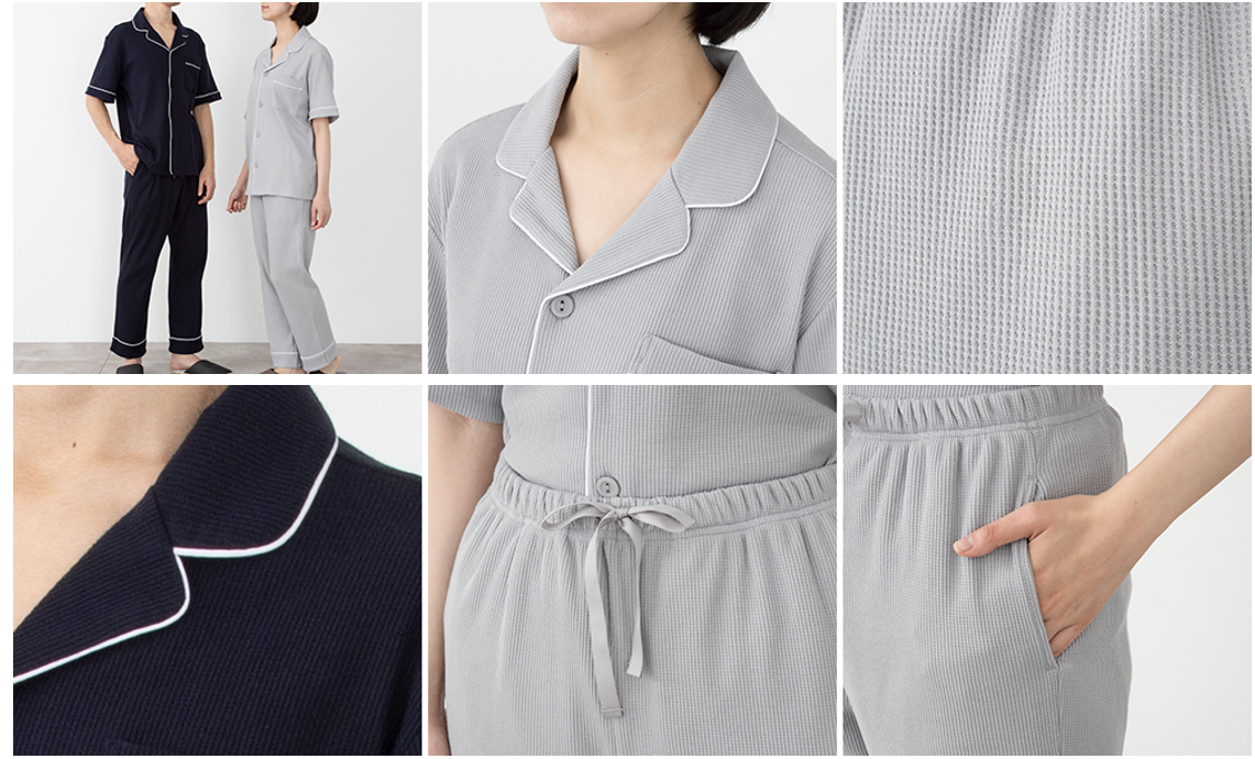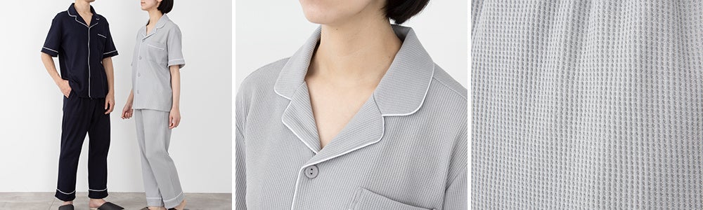 ゆったりと締め付けず、腕やひざの曲げ伸ばしがしやすいよう裾にスリットを入れ、ずっと着ていたくなるような快適な着心地と通気性の良さを実現しました。また、さらりと涼しいワッフルナイトウェアと同じく、ソフトゴムボタンを使用しています。