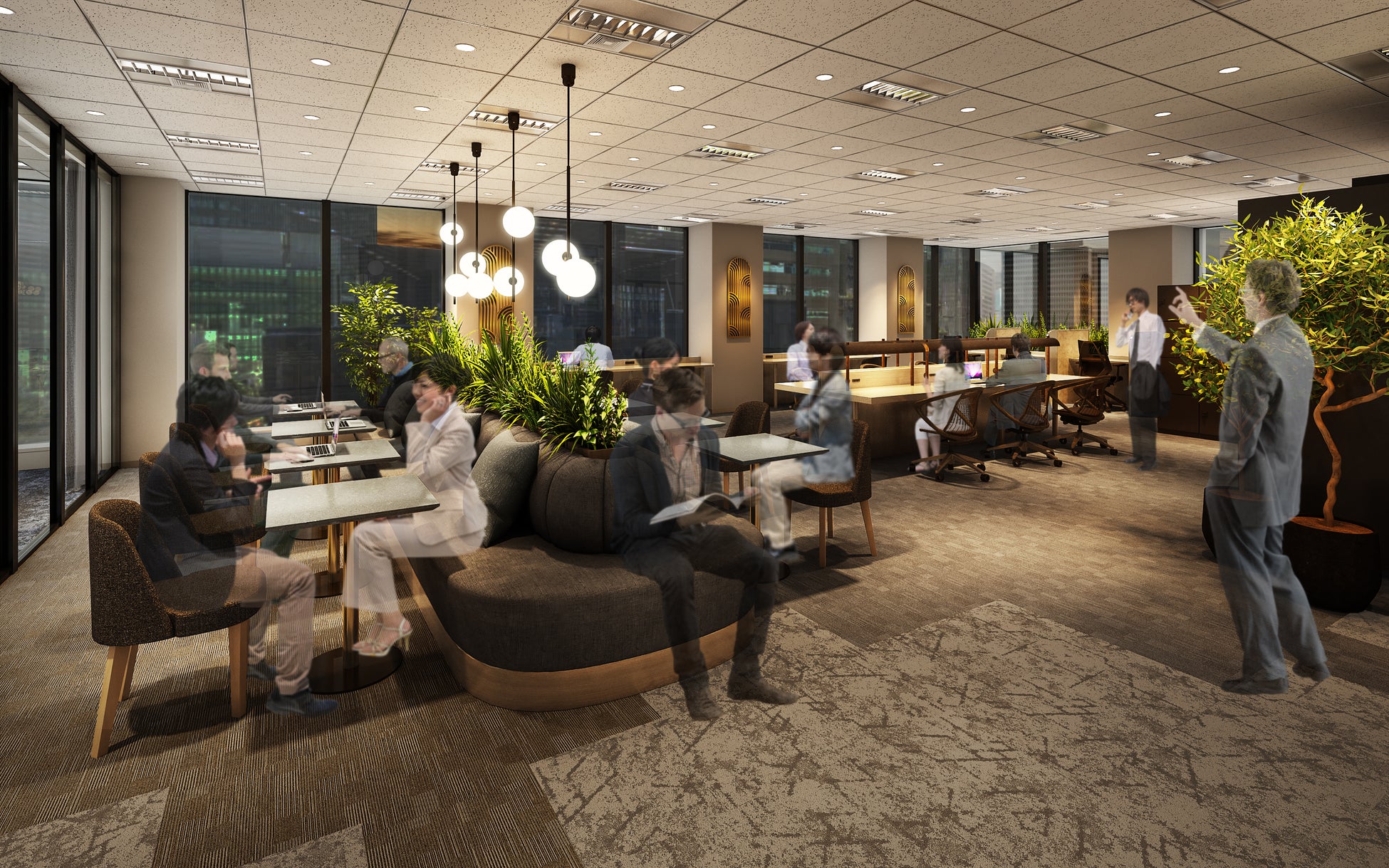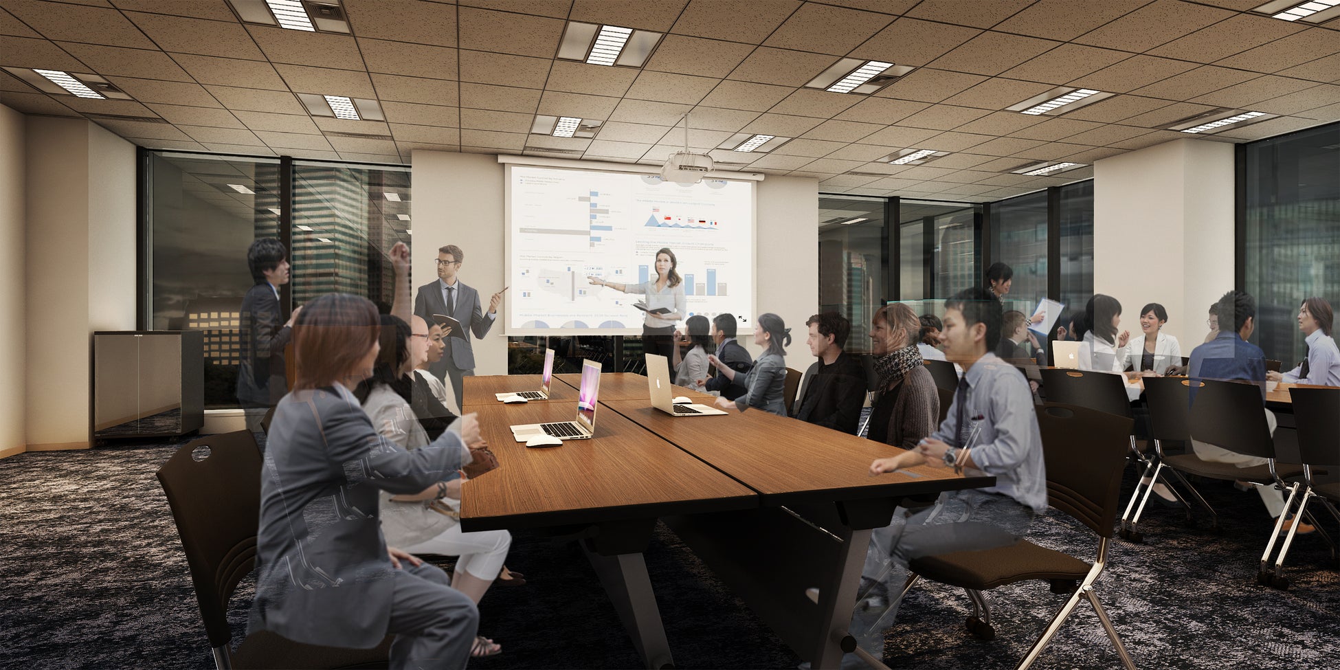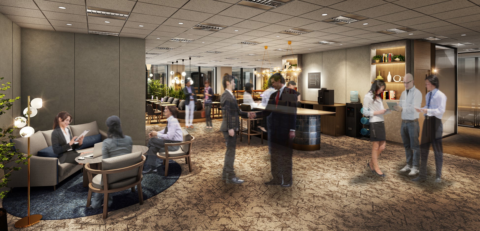 金融業界の未来を担う次世代リーダーが集うにふさわしい、上質で洗練された内装デザインが特徴です。エグゼクティブ・プログラムの受講会場となるセミナー・イベントスペースのほか、個室とコワーキング席からなるシェアオフィス、海外の使節団の訪問や会員同士の交流促進にお使いいただけるラウンジ等、多様な用途に対応した施設構成となっています。また、エントランス付近には施設のビジョンを体現する、象徴的なデジタルアートを設置します。コンセプトは「垂直茶室 - Vertical Tea Room」。本作品は、クリエイティブ集団PARTYが制作しており、日本らしく古くからの社交場である「茶室」を最先端のテクノロジーを用いて次世代スケールに昇華させる意欲的な試みの作品となっています。