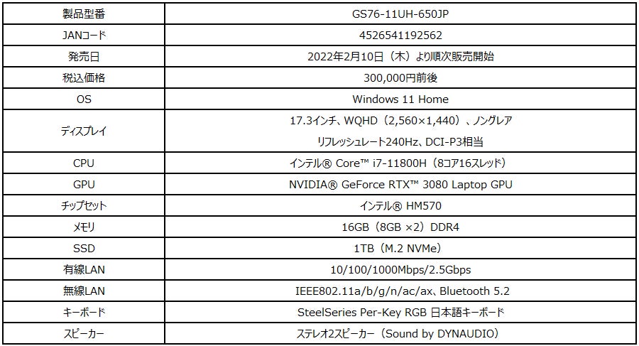 17.3インチ薄型ゲーミングノートPCでWQHD&240Hzがついに誕生!! ハイスペックゲーミングノートPC「GS76-11UH-650JP」 2022年2月10日(木)よりMSIストア限定販売