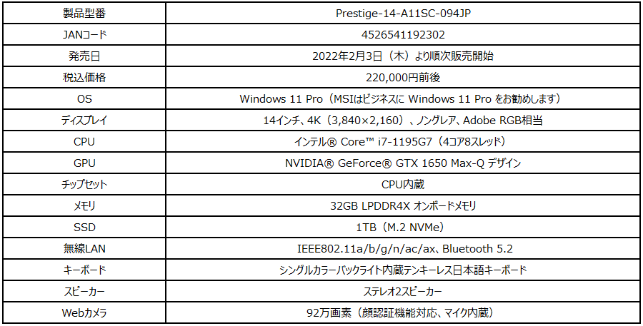 【Prestige-14-A11SC-094JPの特徴】