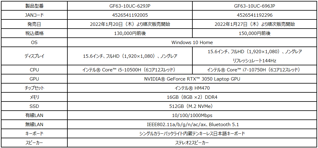 ・MSI公式オンラインショップ販売ページ(GF63-10UC-696JP):https://jpstore.msi.com/shopdetail/000000000297/