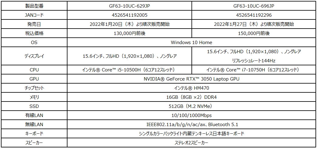 ・MSI公式オンラインショップ販売ページ(GF63-10UC-629JP):https://jpstore.msi.com/shopdetail/000000000290/