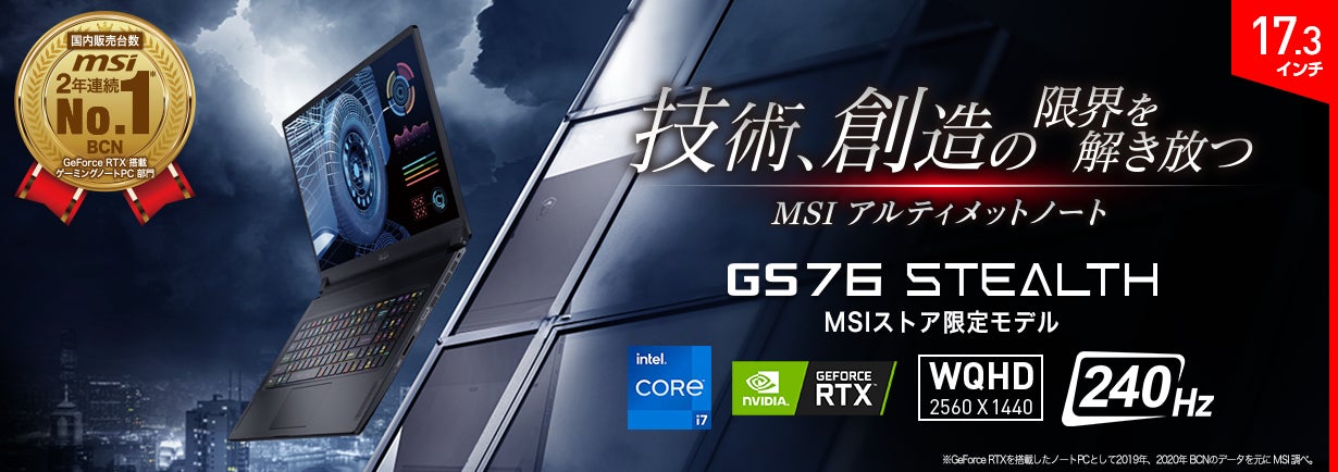 この度、エムエスアイコンピュータージャパン株式会社は、薄型ゲーミングノートPCとして日本国内でも人気の『GS Stealth』シリーズより、17.3インチ・WQHD(2,560×1,440)・リフレッシュレート240Hzゲーミング液晶パネルを採用した「GS76-11UH-650JP」を2022年2月10日(木)よりMSIストア限定で販売を開始いたします。また、「一目で欲しくなる性能と価格」というコストパフォーマンスを追求したゲーミングノートPC『Katana GF』シリーズと『GF63 Thin』のオンラインストア向け新生活モデルやWindows 11をプリインストールしてAdobe RGB相当の広色域4K液晶パネルを搭載した『Prestige』シリーズのMSIストア限定新生活モデルを2022年1月20日(木)以降順次発売いたします。