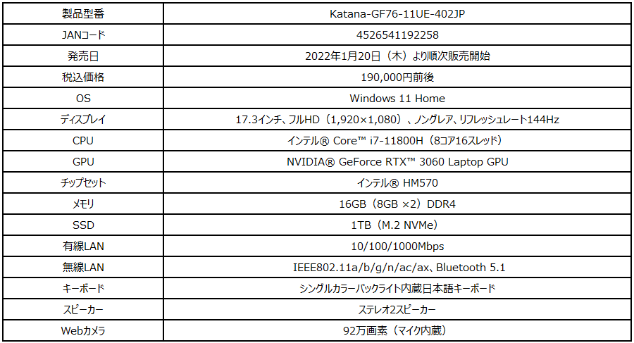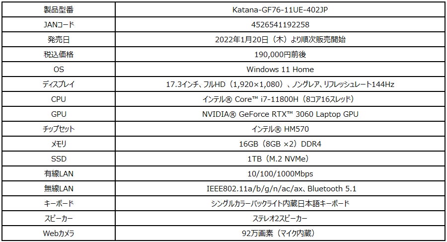【Katana-GF76-11UE-402JPの主な特徴】