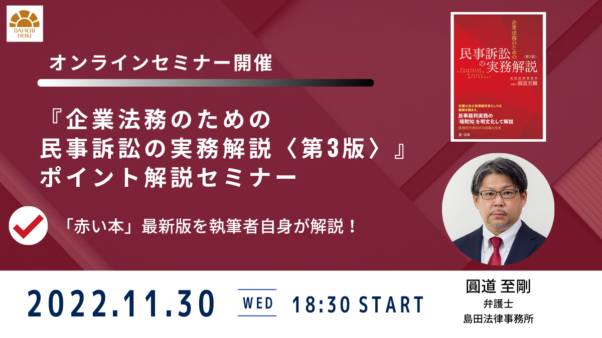 法律関連出版物、各種データベースを提供する第一法規株式会社(所在地:東京都港区、代表取締役社長:田中 英弥)は「『企業法務のための民事訴訟の実務解説〈第3版〉』ポイント解説セミナー」を2022年11月30日に開催いたします。
