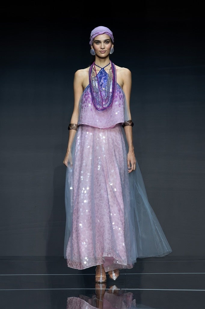 メタリックや玉虫色の控え目な輝き、刺繍が施されたベールのような透け感のある素材で仕立てられた軽やかなコレクションです。
