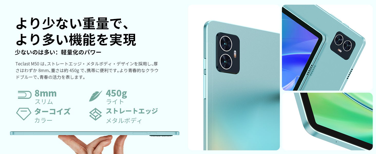 Teclast M50は10.1インチフルHD大画面で、IPSテクノロジーにより178°の超広視野角を実現しました。1280 × 800のHD解像度により、鮮明さと消費電力のバランスがとれています。TDDI統合タッチテクノロジーにより、従来のG+Gプロセスタッチスクリーンより120Hzの高いタッチサンプリングレートを持ち、信号干渉も排除されました。ストレートエッジメタルボディデザインを採用し、厚さは8mm、重さは約450gで、携帯に便利です。