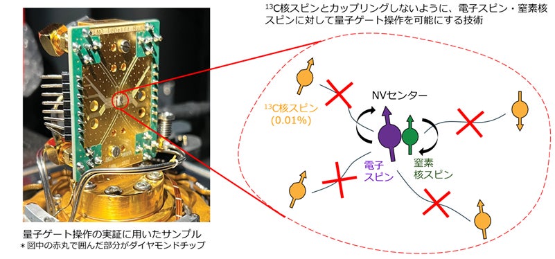 Element Six(注4)とデルフト工科大学が共同開発した、炭素13同位体濃度を天然ダイヤモンドにおける濃度約1%から1/100に下げたダイヤモンドを使用し、その中のNVセンター(注5)を使って量子ビットを作製しました。これにより環境ノイズの原因となる不要な核スピンを除去でき、電子スピンと14窒素核スピンからなる安定な2量子ビットの系を形成できました。 -