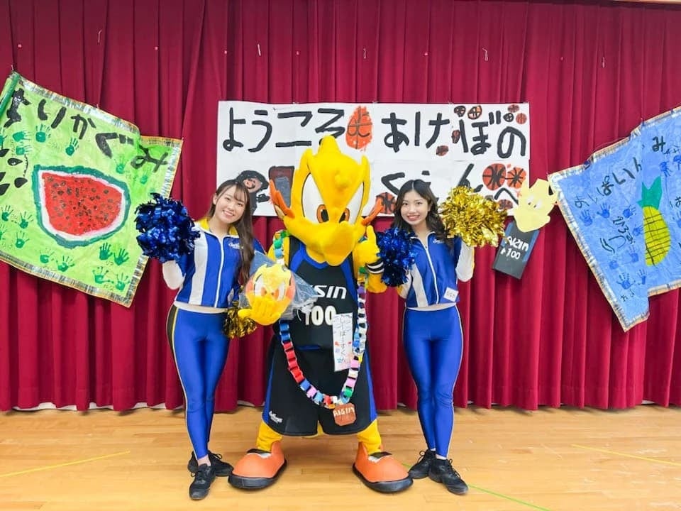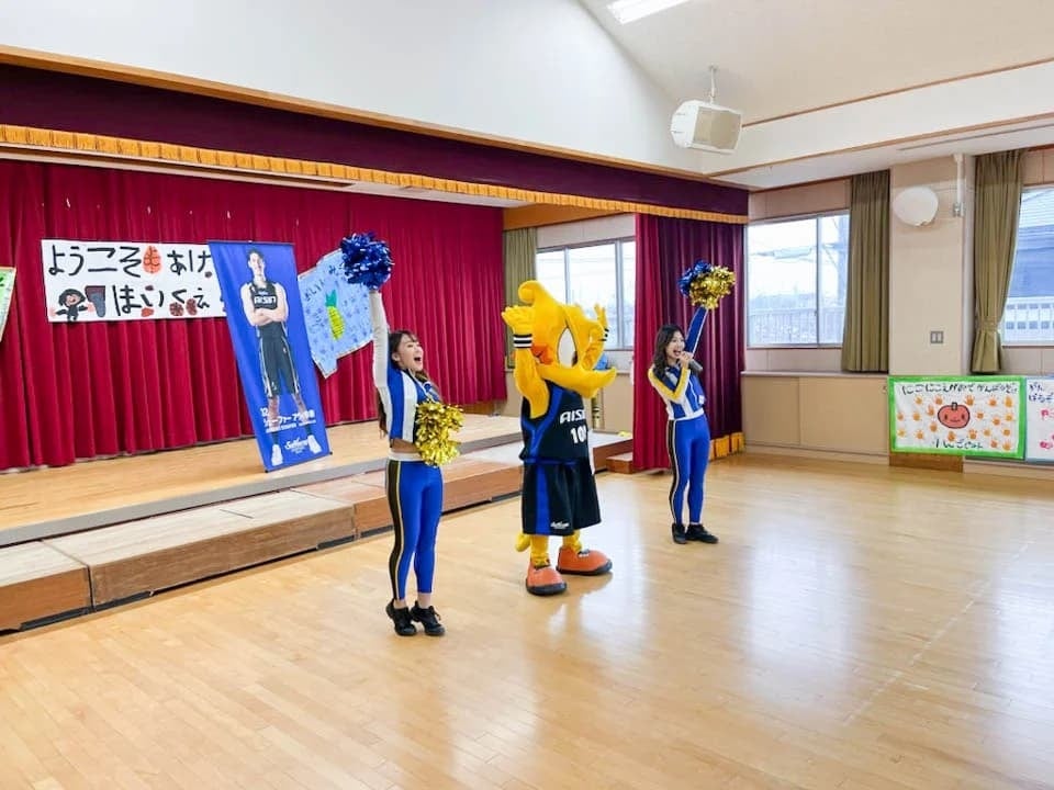 2024年2月5日(月)、シーホースくんとSuper GirlsのMIDORI、NANAKAがあけぼの保育園(安城市)を訪問し、園児の皆さんと一緒にクイズやダンスを楽しみました。