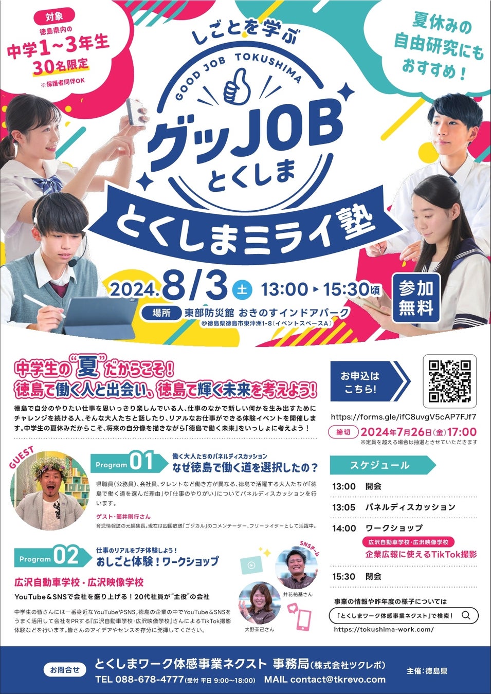 【中学生対象】とくしまワーク体感事業ネクスト『とくしまミライ塾』の開催について