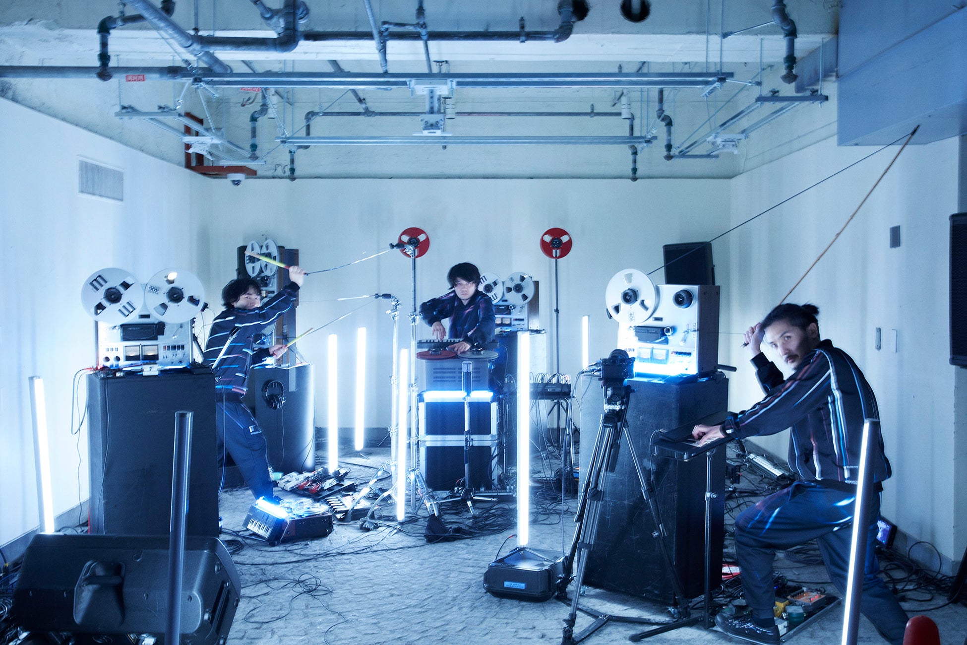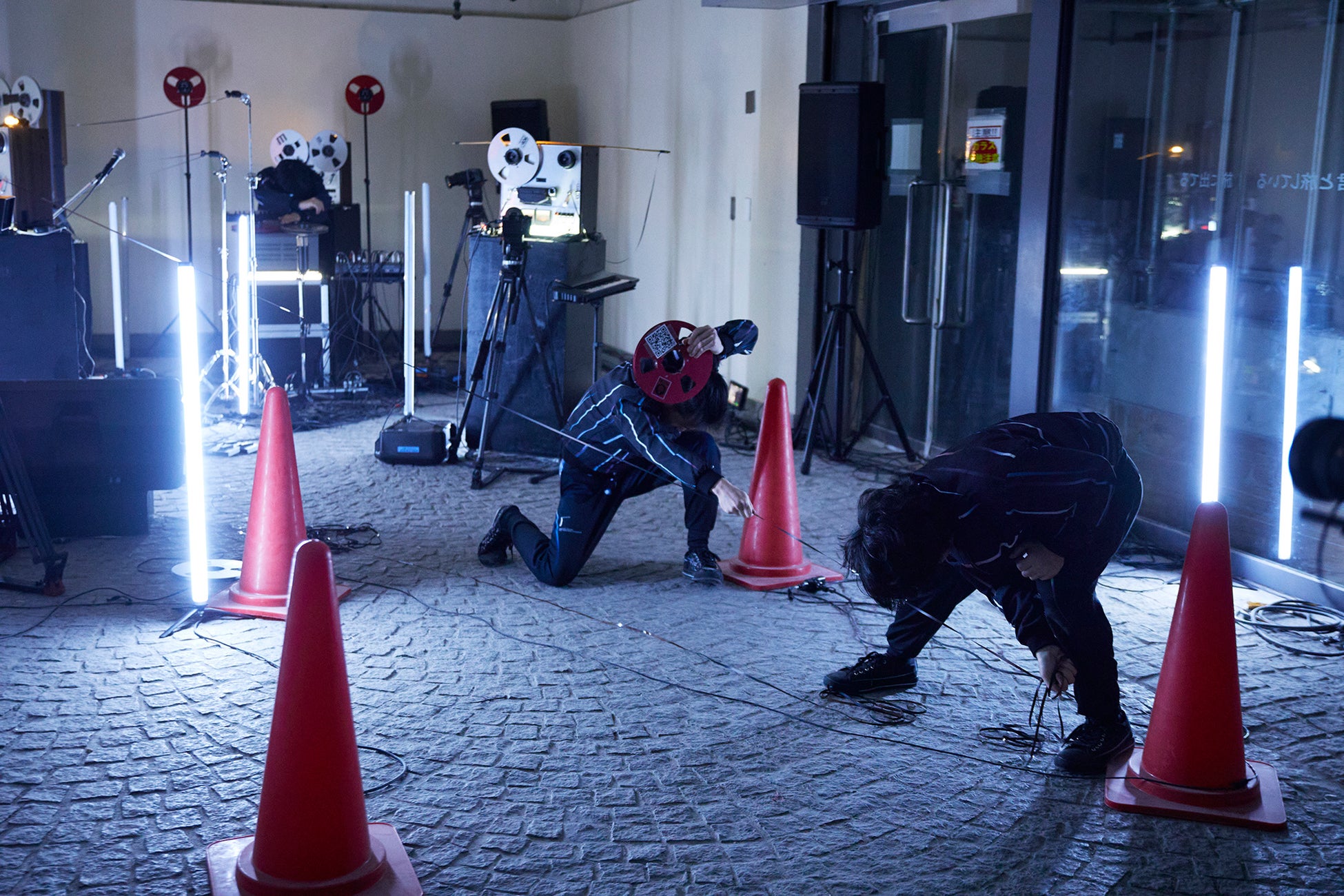 磁気テープを使った記録再生装置、オープンリール式テープレコーダー。かつては多くの録音スタジオで使用され、カセットテープが主流になる70年代までは一般家庭でも家庭用のものが普及していたが、このヴィンテージ機材を楽器として奏でるバンドがいる。それがOpen Reel Ensembleだ。メンバーは和田永、吉田悠、吉田匡の3人。改造を加えられたオープンリールがコンクリート剥き出しの現場に立ち並ぶGinza Sony Parkの工事現場に、揃いの衣装を着用した3人が現れた。