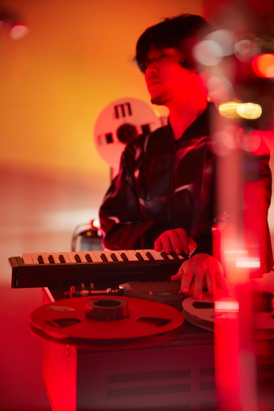 Open Reel Ensembleはライヴの2日前に久々の新曲「Magnetik Phunk」をリリース。この日の3曲目として披露された。「Magnetik Phunk」はOpen Reel Ensemble流のエレクトロファンクだ。和田がマイクを握ってシャウトすると、みずからその声をオープンリールで録音し、すぐさまスクラッチする。ライティングも相まって、未来の地下ディスコに紛れ込んでしまったかのような錯覚に陥る。